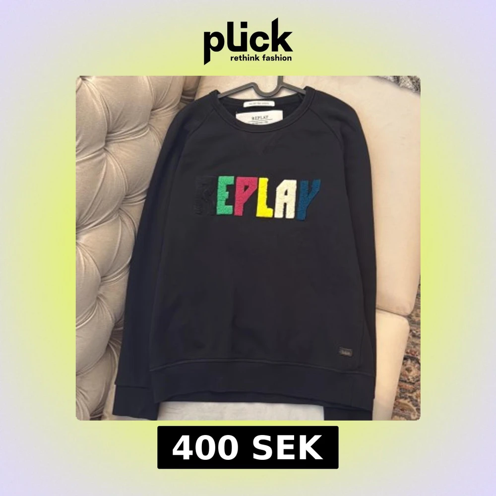 Svart sweatshirt från Replay med REPLAY broderat i stora bokstäver på bröstet i svart, grönt, rött, gult, vitt och blått. Klassisk rund halsringning och långa ärmar. Nästan helt ny och använt i sparsamt sick ett fåtalt gånger. Storleken är Small men passar även medium. Ny pris på denna är 1199kr