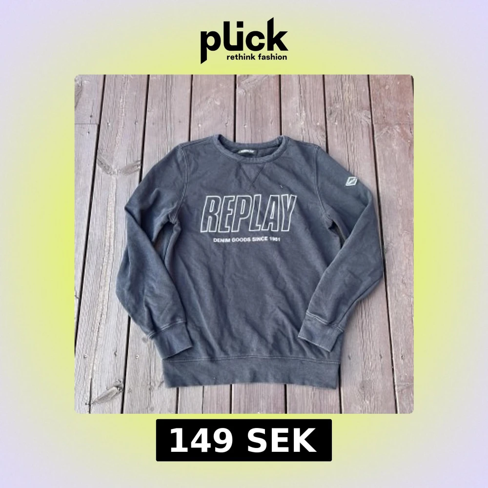 Säljer en svart sweatshirt från Replay med stort tryck på bröstet och texten 'Denim Goods Since 1981'. Tröjan har rund hals, långa ärmar och ribbade muddar vid ärmslut och nederkant. Perfekt för en chill och avslappnad stil.