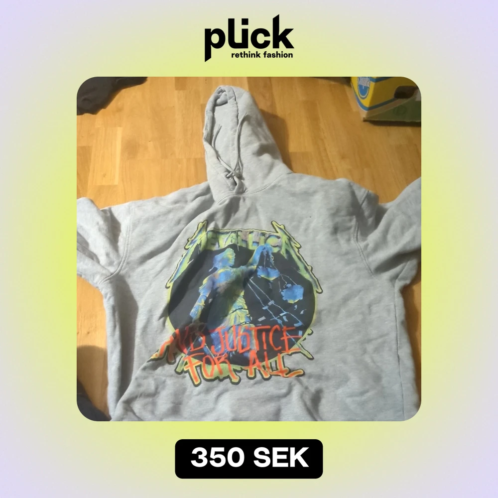Säljer en grå Metallica hoodie med tryck från albumet '...And Justice for All'. Den har en stor färgglad grafik på framsidan och text på baksidan. Perfekt för fans av bandet! Hoodien är i bra skick och har en skön passform med långa ärmar och en klassisk huva.