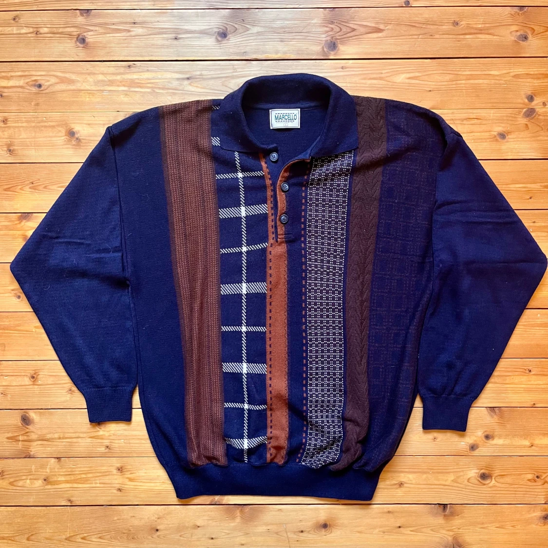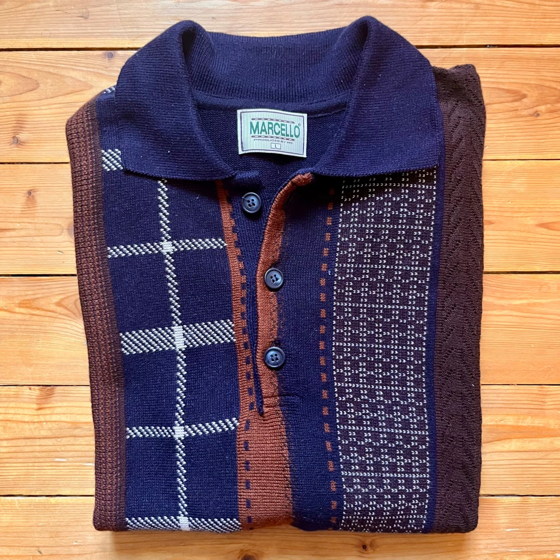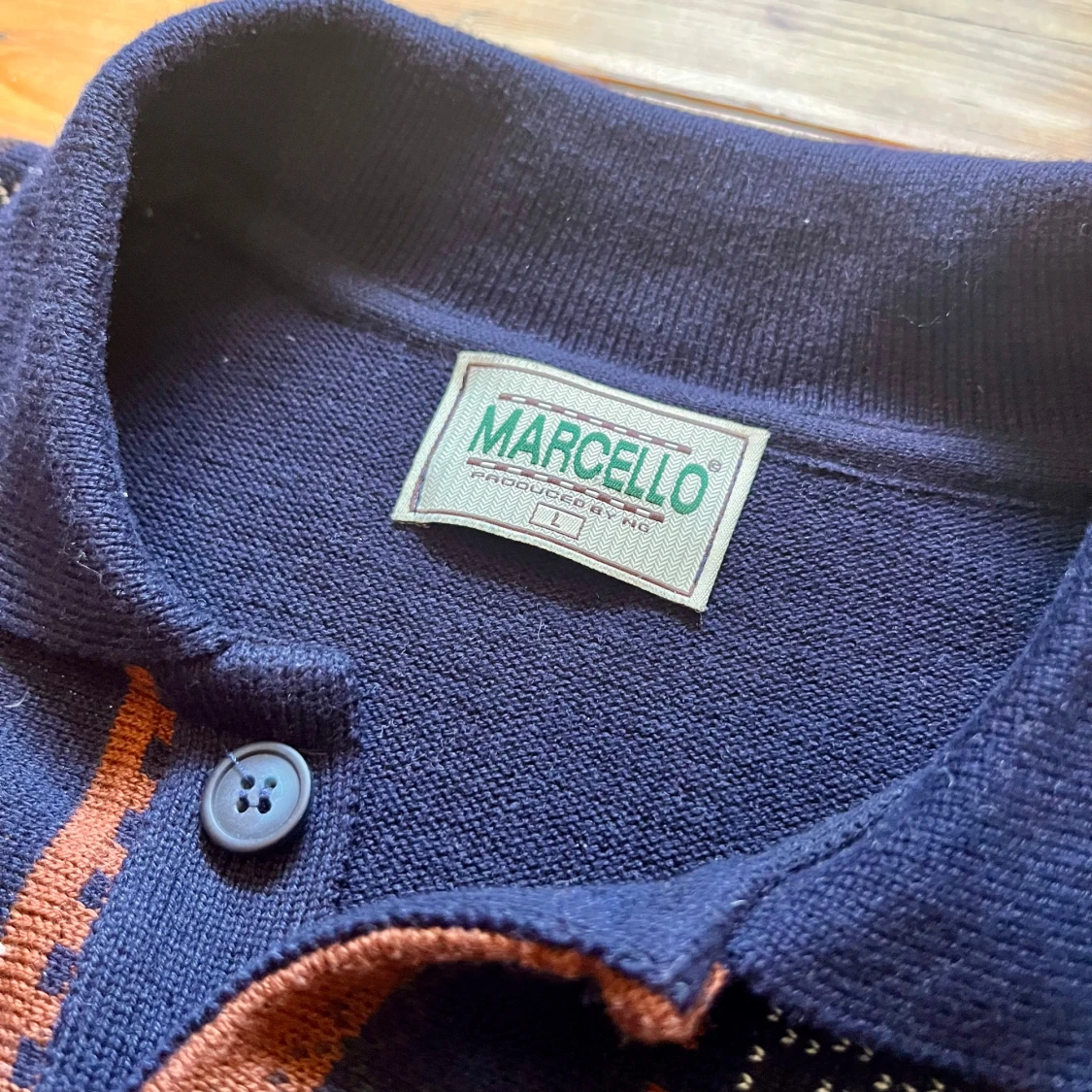 Säljer en retro stickad pikétröja från Marcello i marinblått och brunt med unika mönstrade paneler framtill. Tröjan har krage, knappar vid halsen och långa ärmar. Perfekt för dig som gillar vintagevibbar och coola detaljer.
