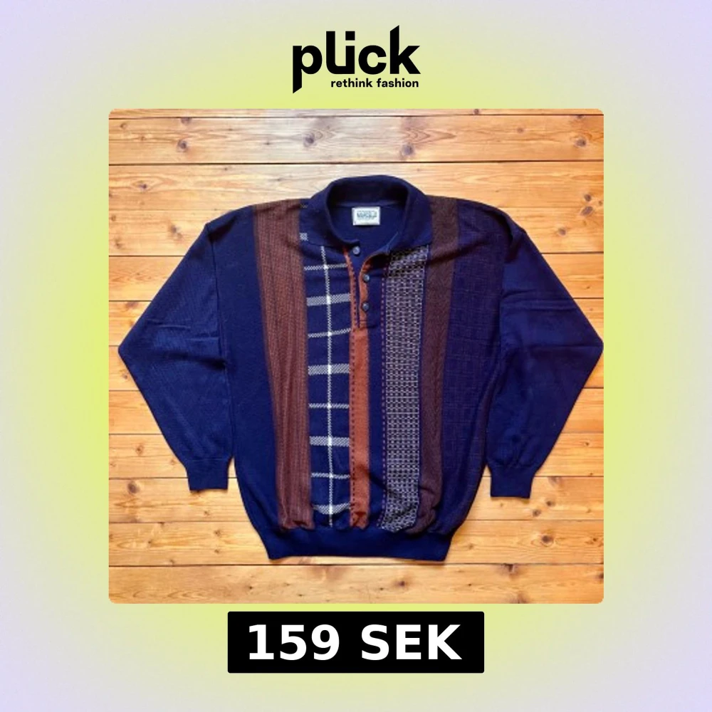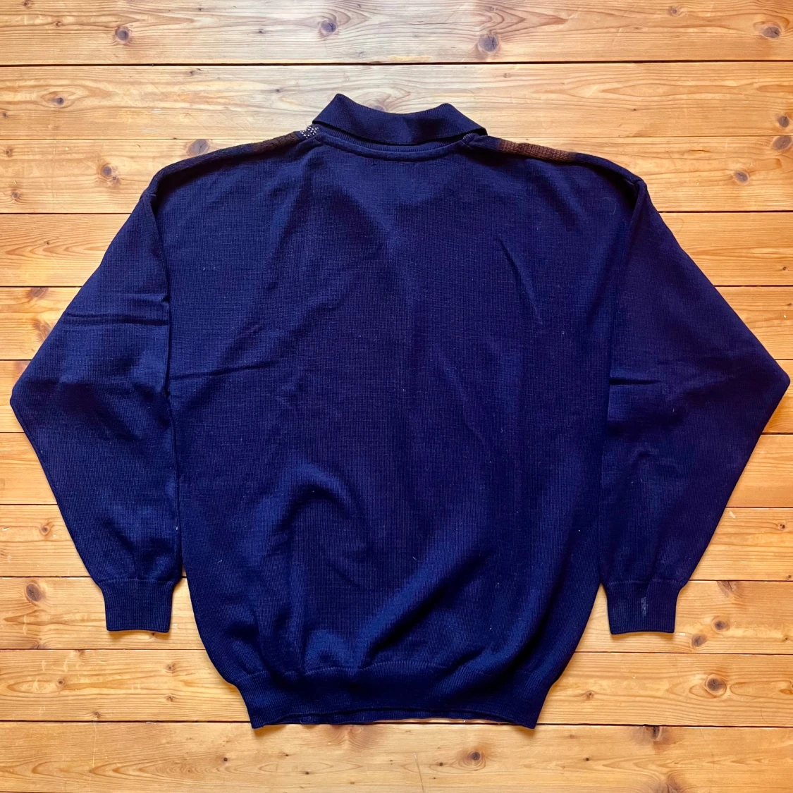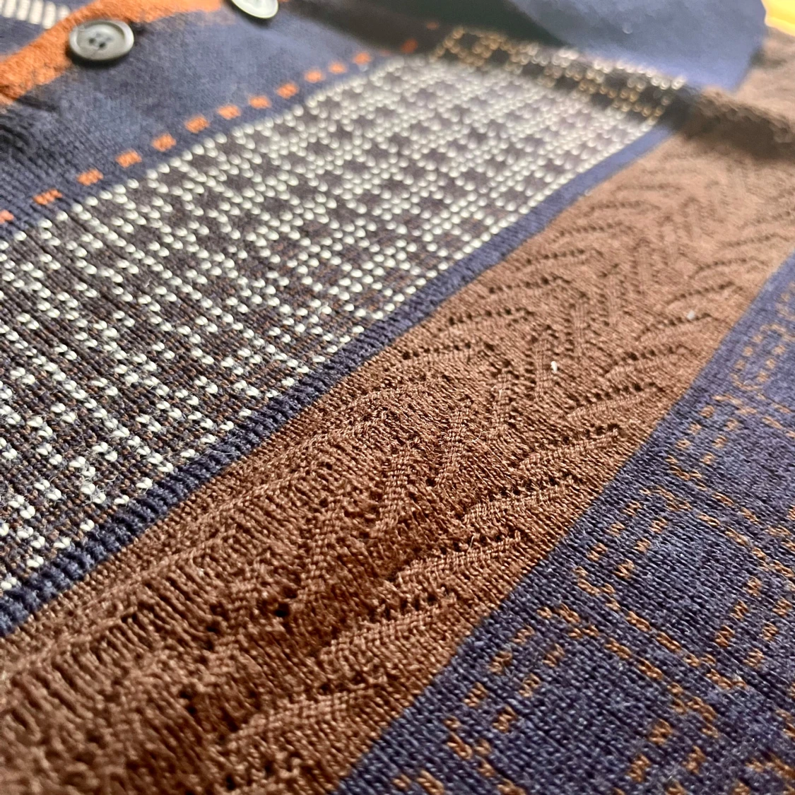 Säljer en retro stickad pikétröja från Marcello i marinblått och brunt med unika mönstrade paneler framtill. Tröjan har krage, knappar vid halsen och långa ärmar. Perfekt för dig som gillar vintagevibbar och coola detaljer.