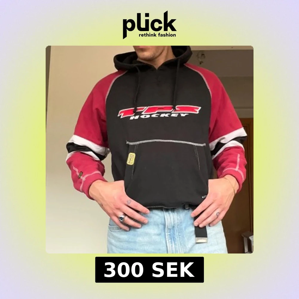 Svart och vinröd hoodie från TPS Hockey med stor logga framtill och coolt Select Stars-tryck på ryggen. Tröjan har huva, magficka och vita samt svarta ränder på ärmarna. Perfekt för dig som gillar sportig och retro stil.