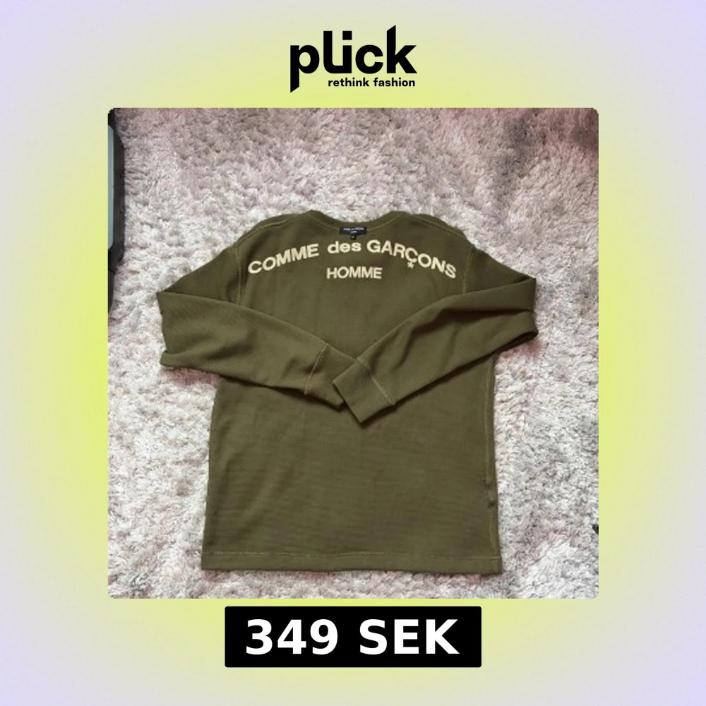 Sparsamt använd - Unik Reversible olivgrön långärmad tröja från Comme des Garçons Homme med beige tryck på övre delen av baksidan. Kan användas både in och ut om du vill ha en chill grön tröja eller en med trycket där back. Ultrasoft bomull, Tröjan har en ribbad rund hals och är tillverkad i ett strukturerat bomullstyg som ger en cool och avslappnad vibe. Perfekt för dig som gillar streetwear och stilrena detaljer. Har ett litet hål på ena sidan, syns knappast men finns.