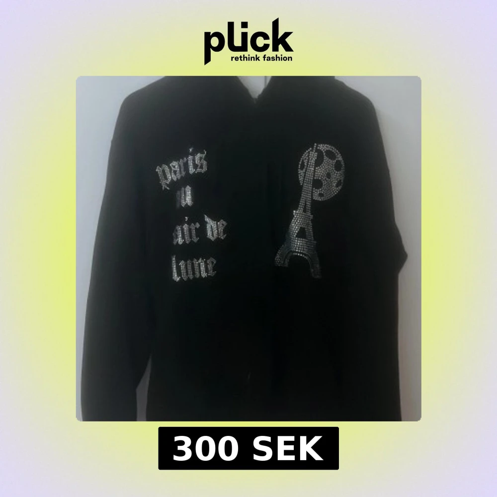 Svart hoodie med huva och coolt Paris-tema i strass på framsidan. Texten 'Paris au clair de lune' och motiv av Eiffeltornet och måne i glittriga stenar ger en unik vibe. Perfekt för dig som gillar statement-plagg och snygga detaljer.