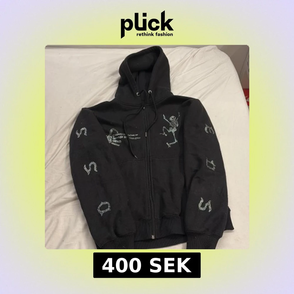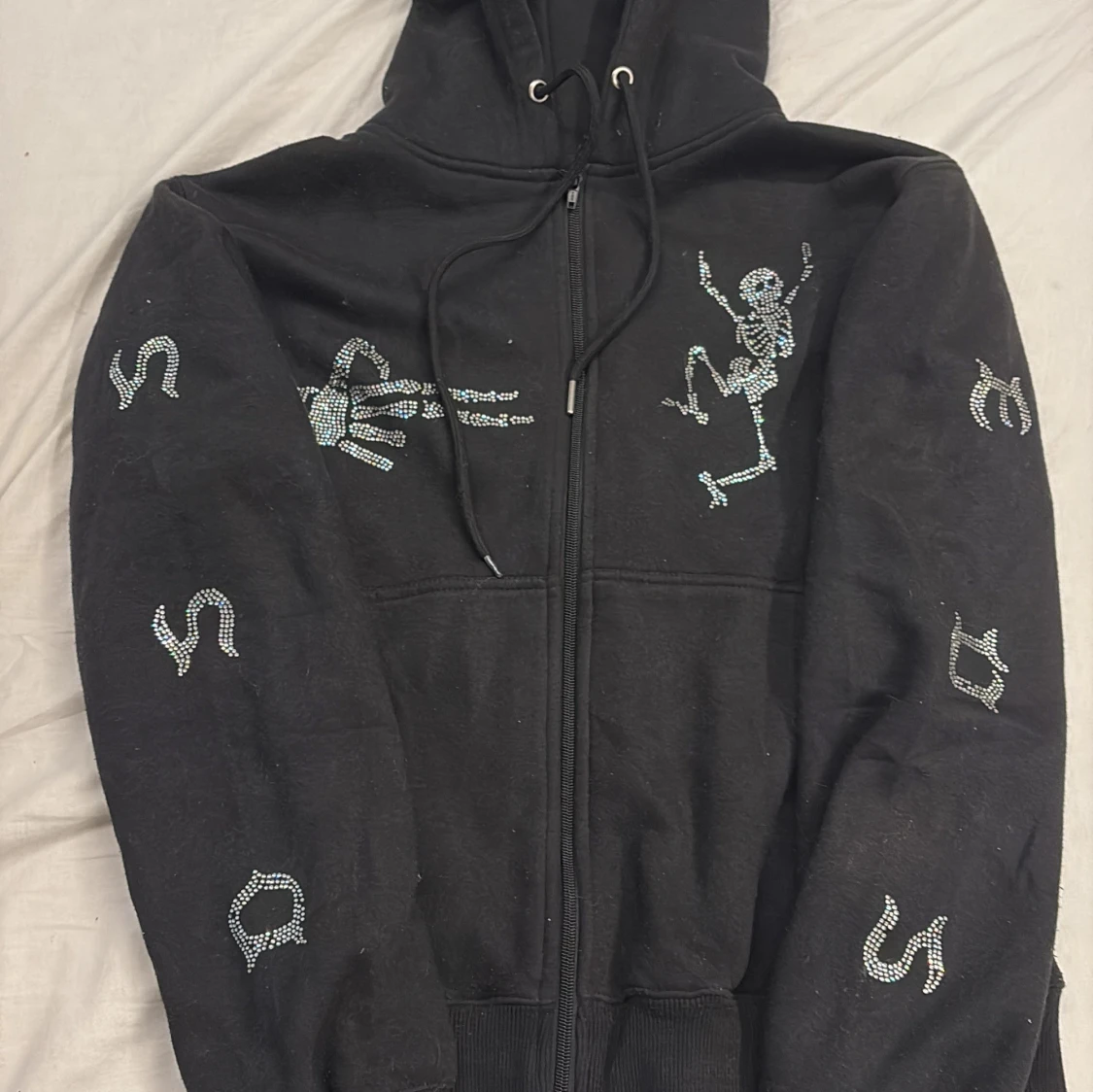 Svart hoodie med dragkedja och huva, dekorerad med glittriga skelettmotiv och symboler i stenar på bröstet och ärmarna. Tröjan har snörning i huvan och ribbade muddar. Perfekt för dig som gillar edgy och unik streetstyle. Nypris 650