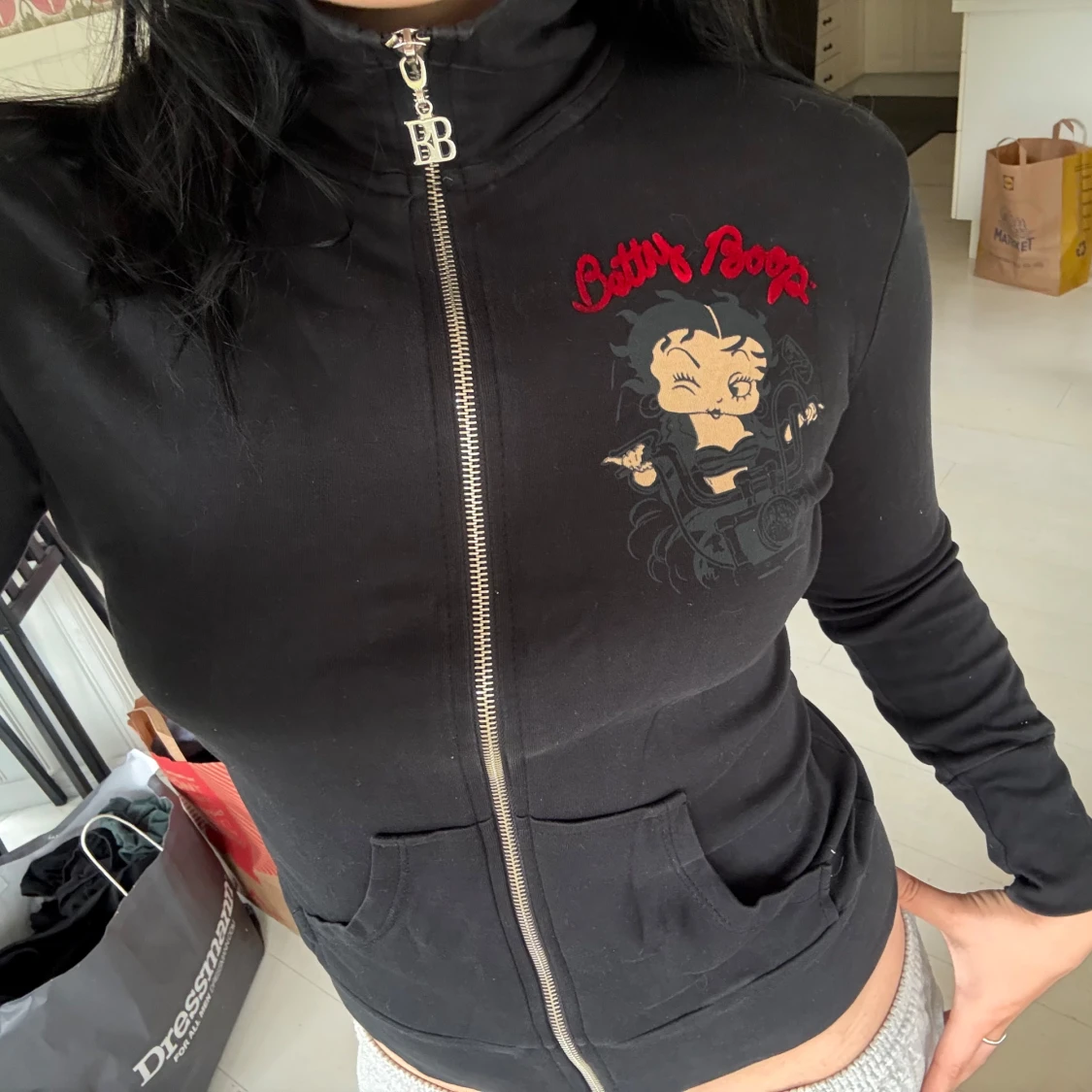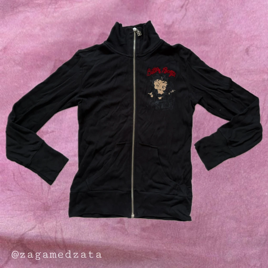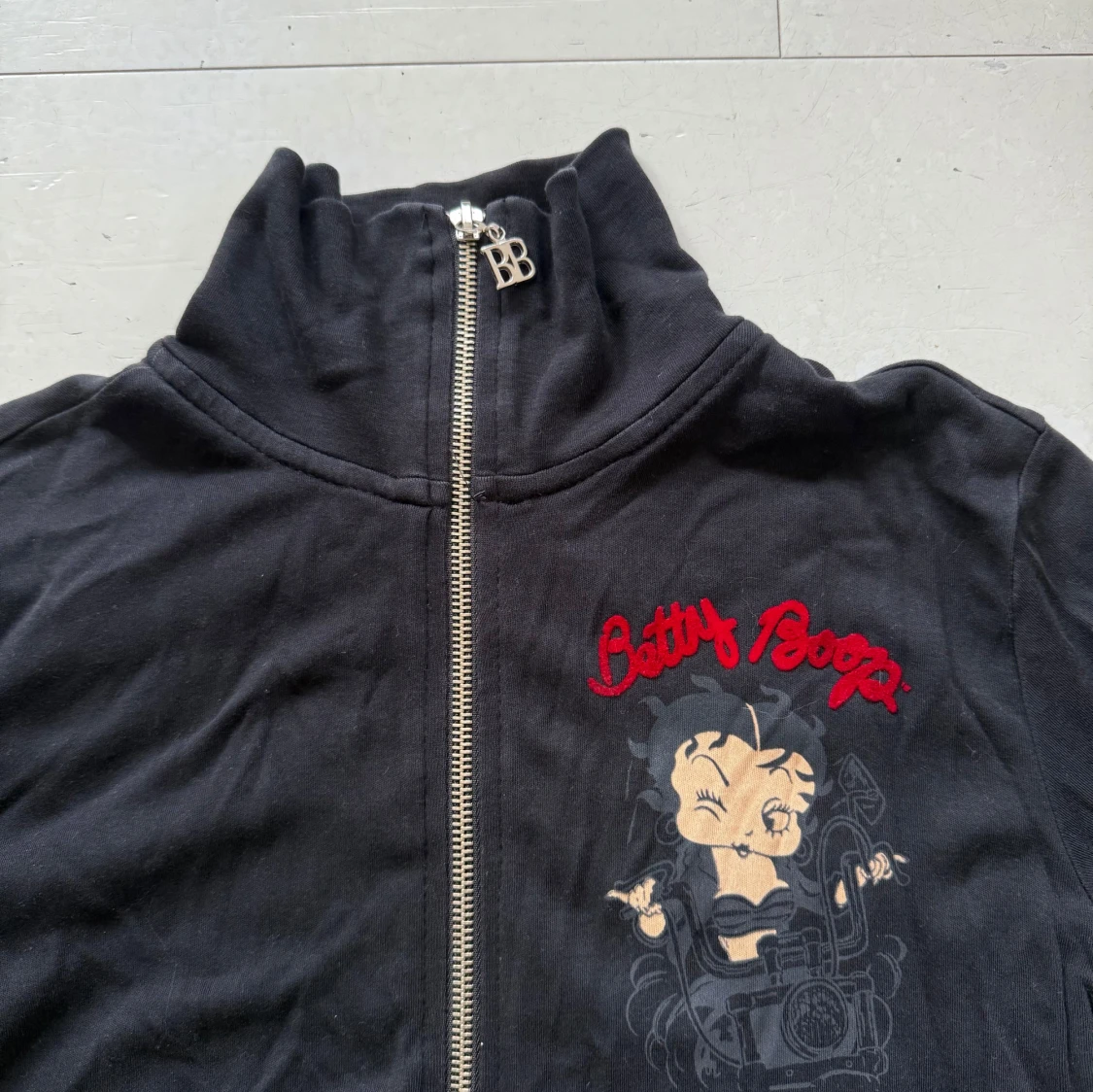 Svart långärmad zipjacka med stort Betty Boop-tryck och röda broderade detaljer fram och bak. Jackan har hög krage, dragkedja med BB-berlock och är gjord i mjuk bomull. Perfekt för dig som vill sticka ut med en ikonisk och lekfull look. Passar mer en storlek S-M.