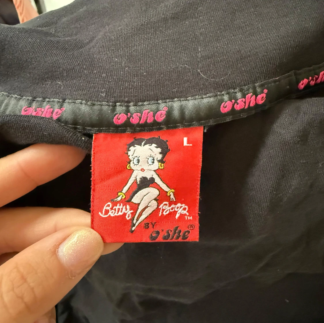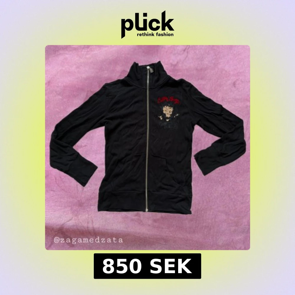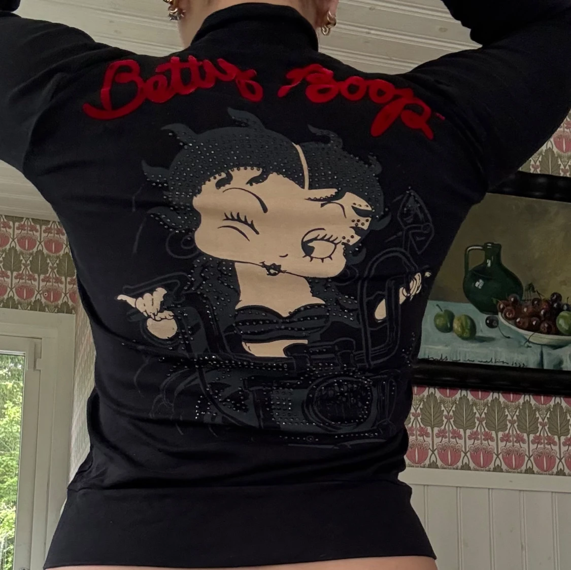 Svart långärmad zipjacka med stort Betty Boop-tryck och röda broderade detaljer fram och bak. Jackan har hög krage, dragkedja med BB-berlock och är gjord i mjuk bomull. Perfekt för dig som vill sticka ut med en ikonisk och lekfull look. Passar mer en storlek S-M.