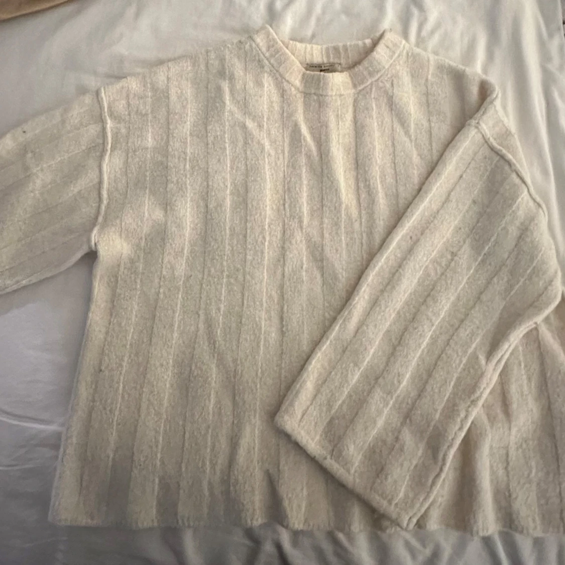 Mysig ribbad stickad tröja i beige från Gina Tricot. Tröjan har en relaxed fit med breda ärmar och rund halsringning. Perfekt för lager-på-lager och chill höst- och vinterdagar. Enkel att matcha med jeans eller kjol. Gott skick, använd få gånger. (FRAKT INGÅR EJ)