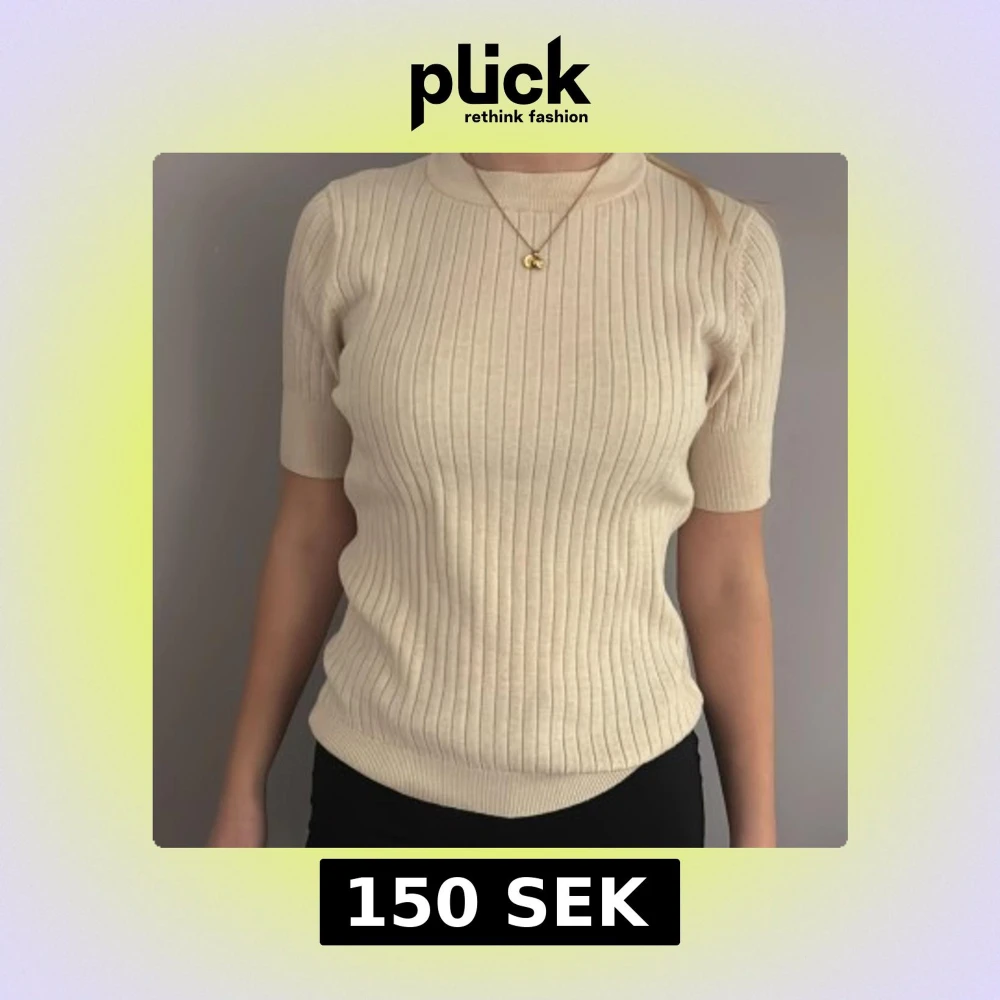 Säljer en ribbad beige tröja från Object i storlek XS. Tröjan har korta ärmar, rund halsringning och har ribbat mönster. Den är mjuk och stretchiga i materialet. Den har en liten fläck på ryggen som är relativt osynlig om man inte kollar noggrant.