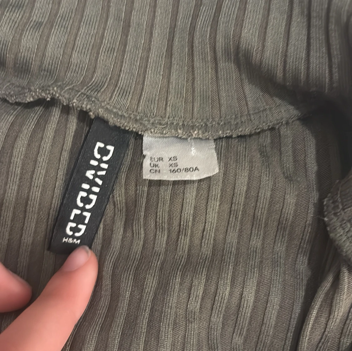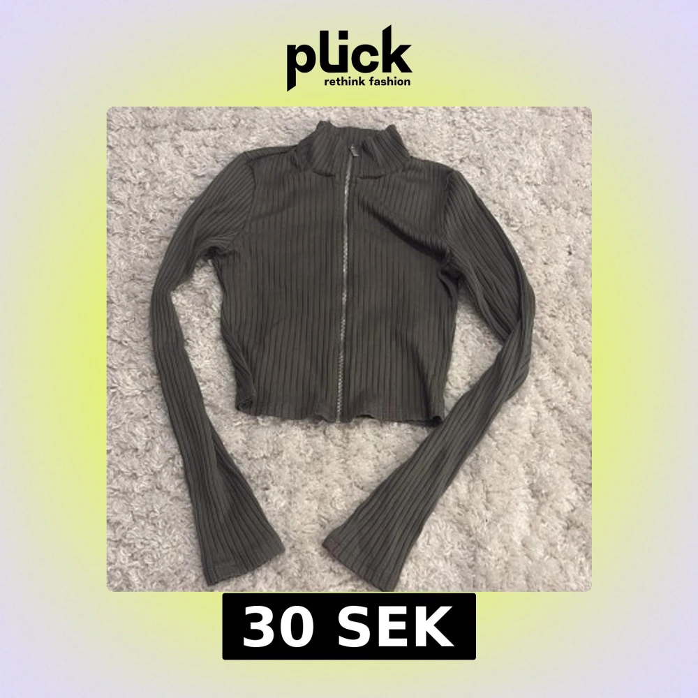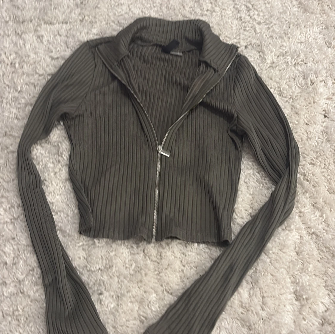 Snygg croppad kofta i mörkgrått från H&M Divided, storlek XS. Tröjan har ribbad struktur, lång ärm och dragkedja framtill. Perfekt att slänga på över en topp för en chill look. Materialet är mjukt och stretchigt, vilket gör den skön att bära.