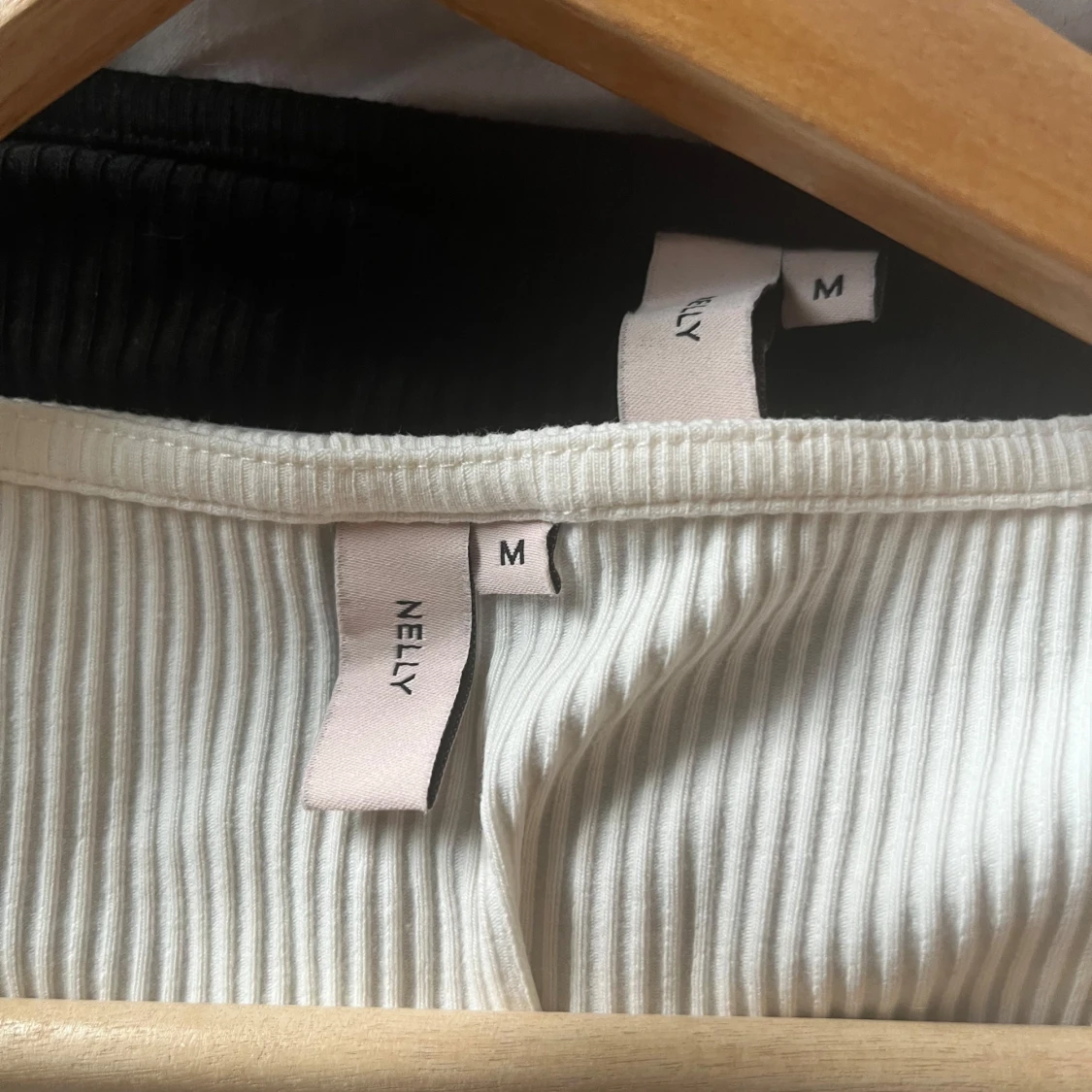 Säljer två ribbade toppar med snygg sweetheart-ringning. Finns i både svart och vit. Perfekt att styla med jeans eller kjol för en trendig look. Materialet är stretchigt och sitter snyggt på kroppen.