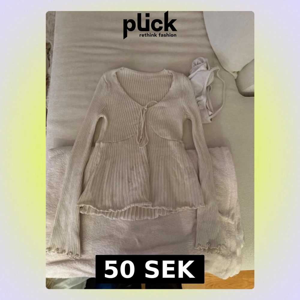 Säljer en superfin ljusbeige ribbad topp med lång ärm och v-ringning. Toppen har snörning framtill och volangkant vid ärmslut och nederkant. Materialet är mjukt och stretchigt, perfekt för en chill och snygg look.