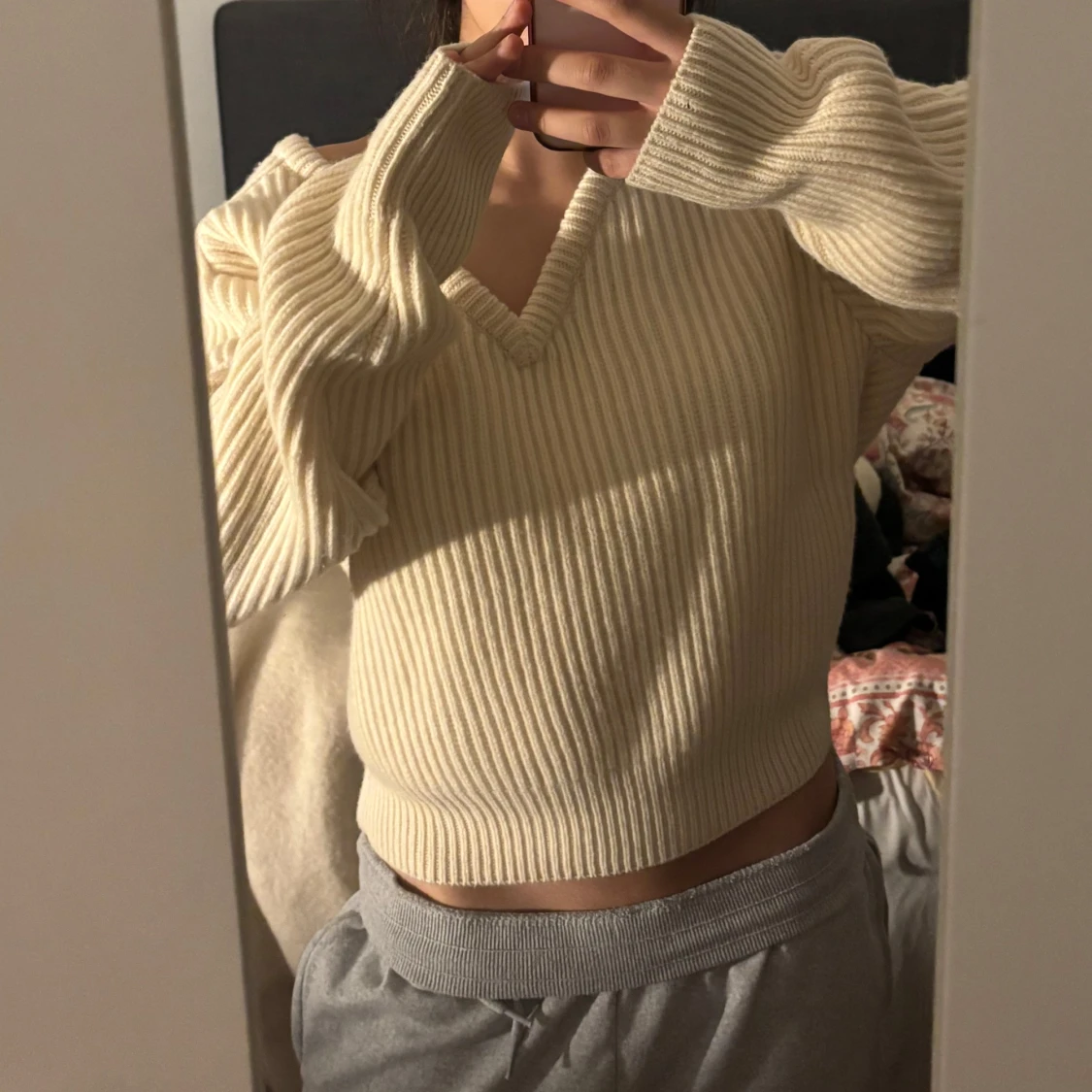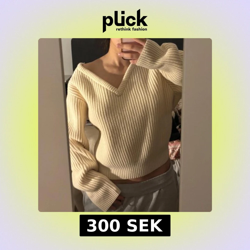 Säljer en ribbad offwhite tröja med v-ringning och croppad passform. Tröjan har långa ärmar och är tillverkad i ett mjukt stickat material. Perfekt för lager-på-lager och enkel att matcha med olika outfits.