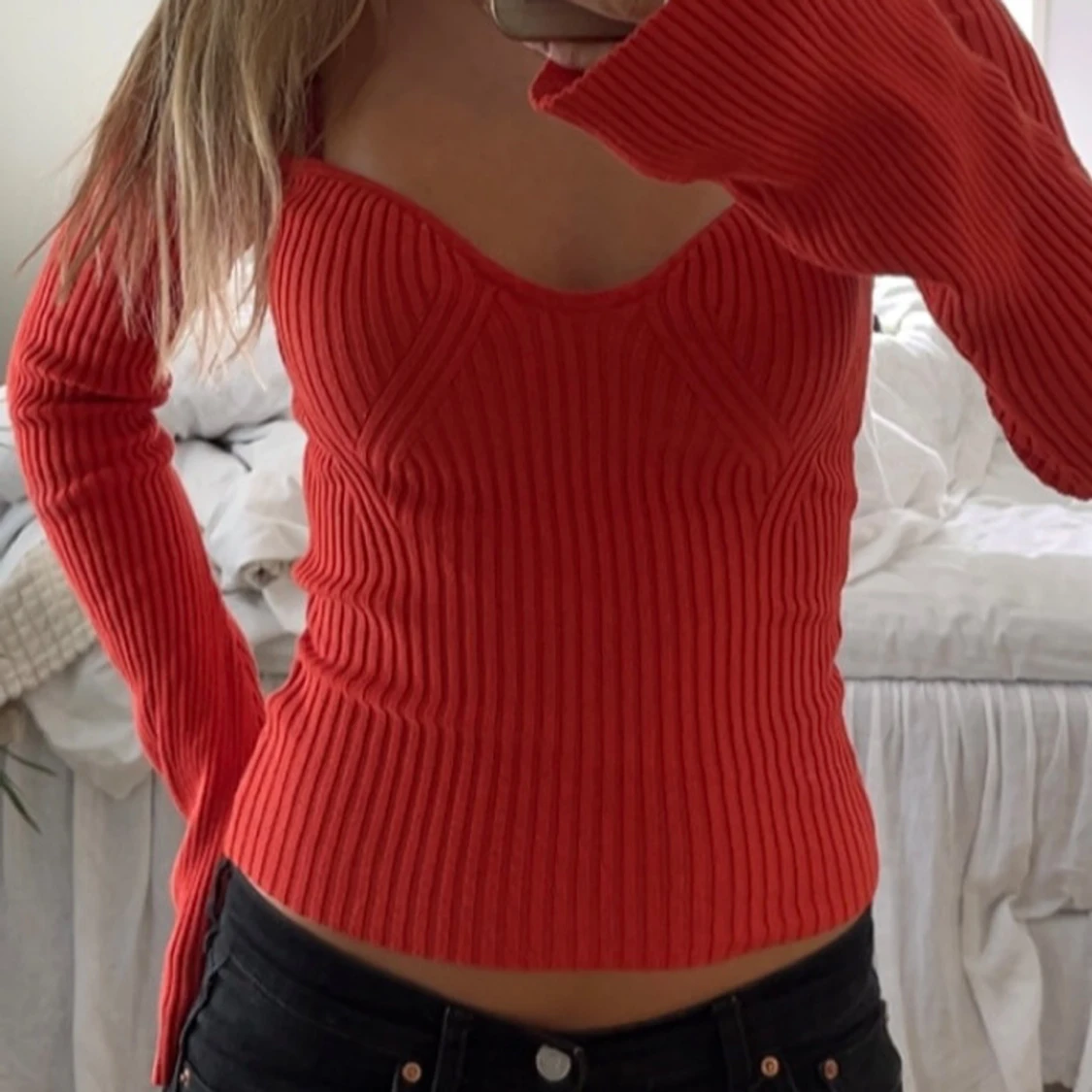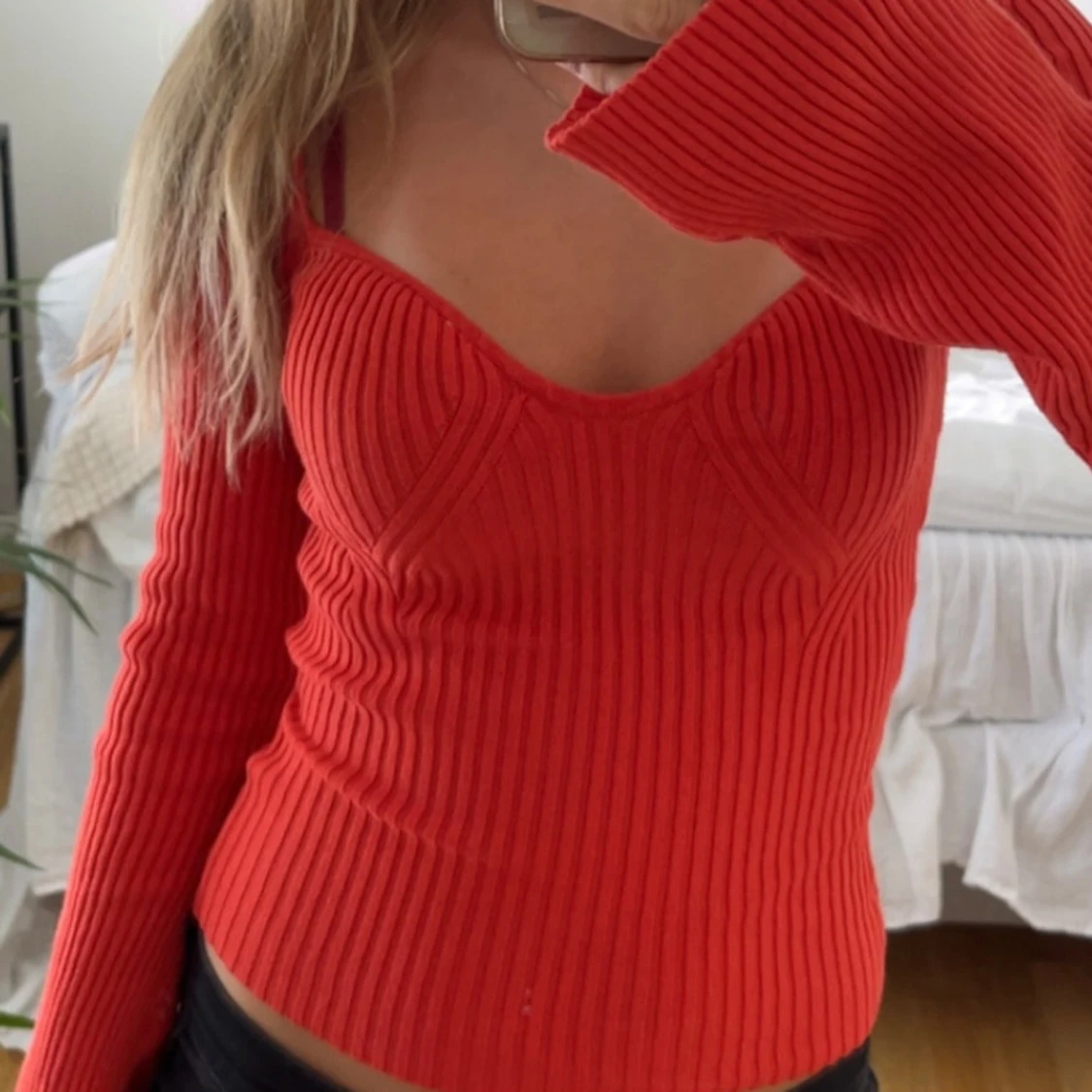Säljer en snygg och skön ribbad röd långärmad topp med en ganska djup urringning. Den är från hm och i bra skick då den använts fåtal gånger💕