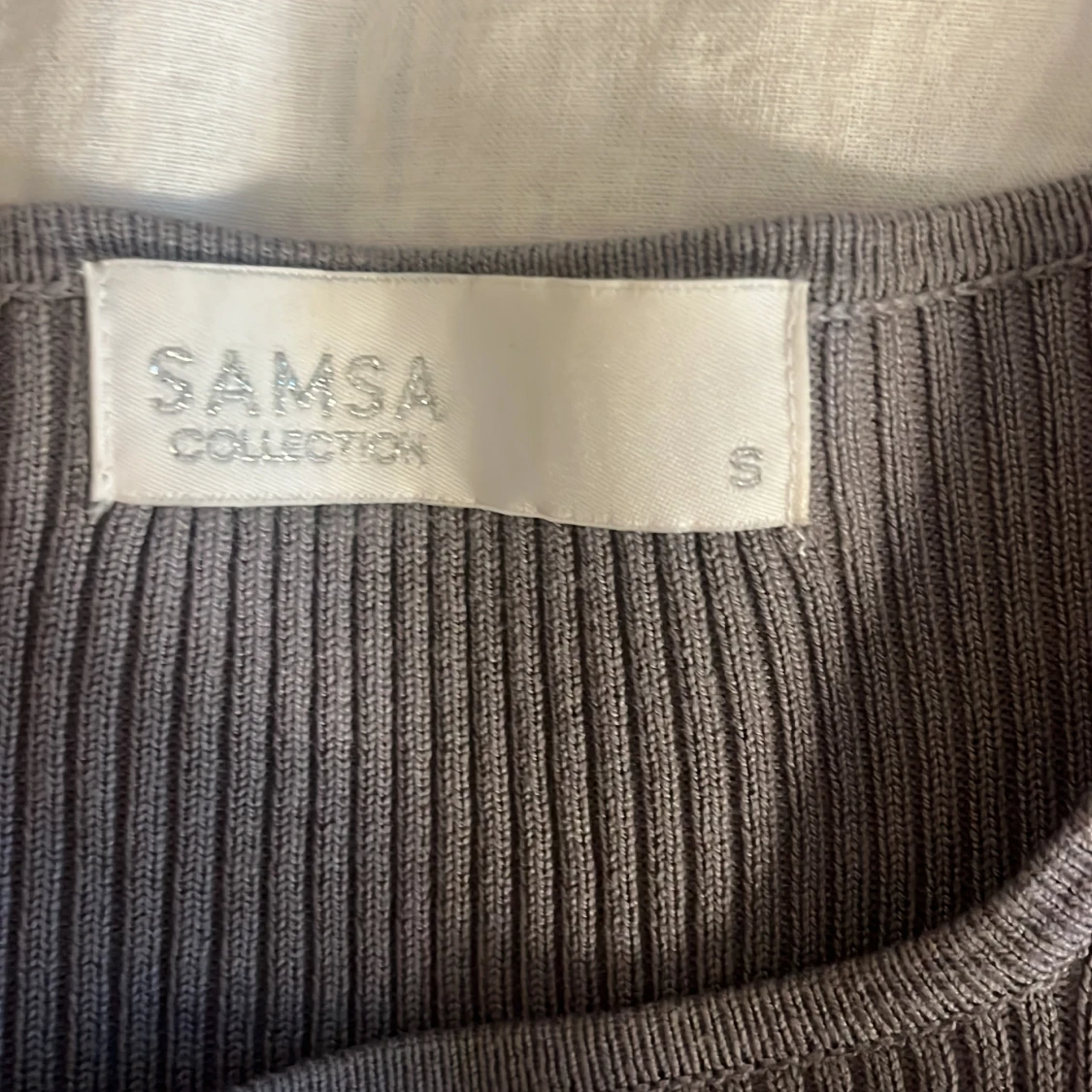 Supersnygg grå ribbad tröja från Samsa Collection med lång ärm och fyrkantig ringning. Perfekt basplagg med tight passform som funkar till allt. Mjuk och stretchig, passar både till jeans och kjol.