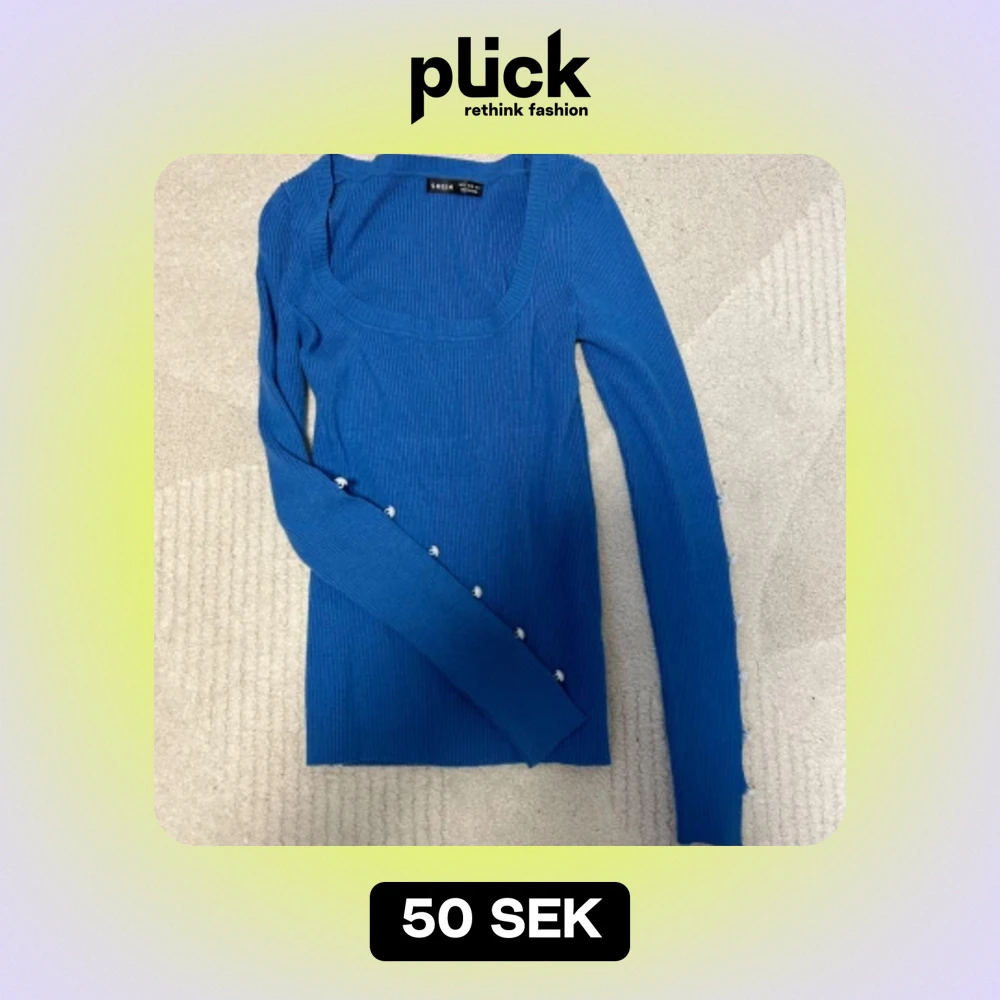 Blå ribbad tröja med pärlor på armarna i storlek 36. Knappt använd.