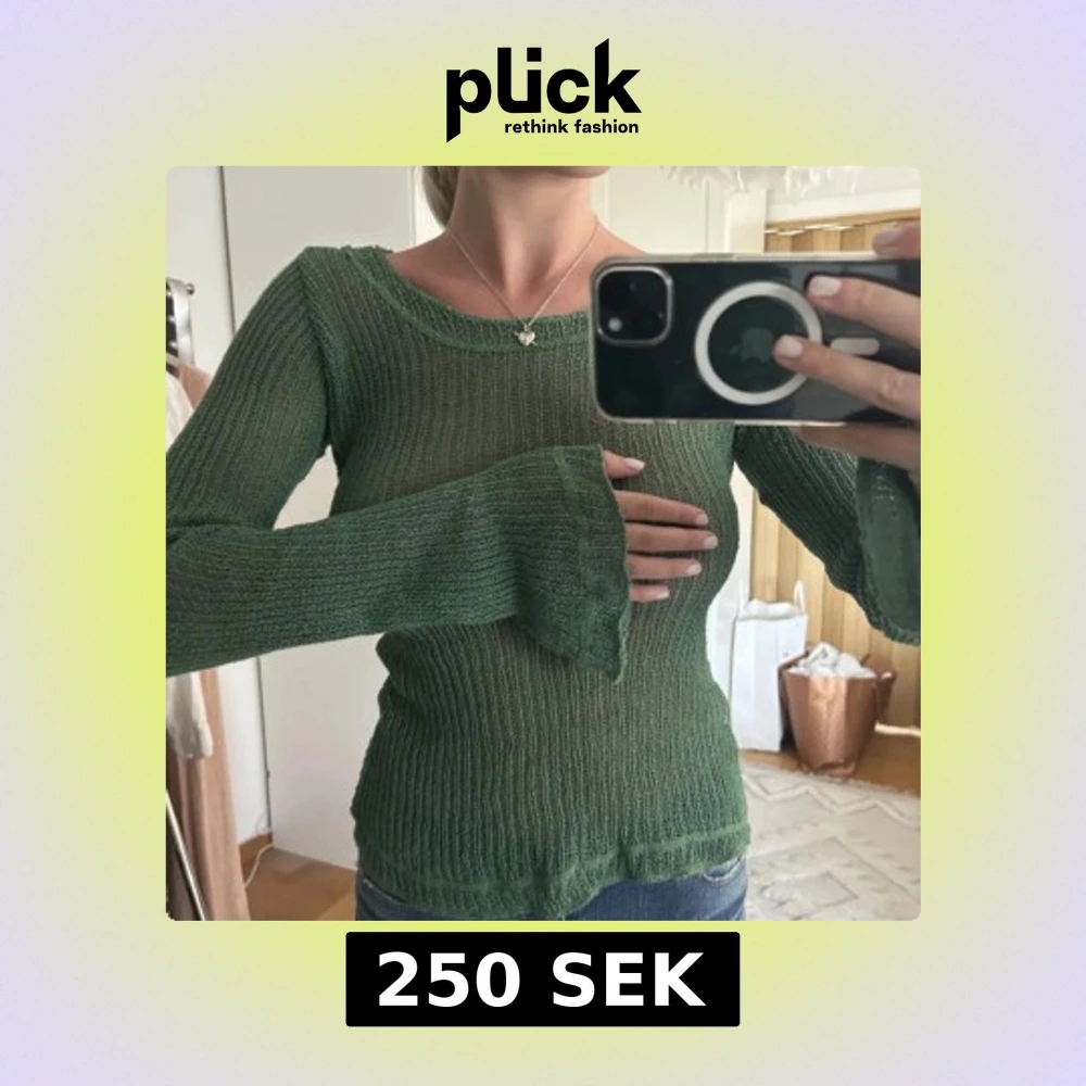 Säljer en tunnstickad grön tröja med ribbat mönster och långärmad modell. Tröjan har lätt utsvängda ärmslut och en något transparent känsla, perfekt för lager-på-lager. Snygg till både jeans och kjol.