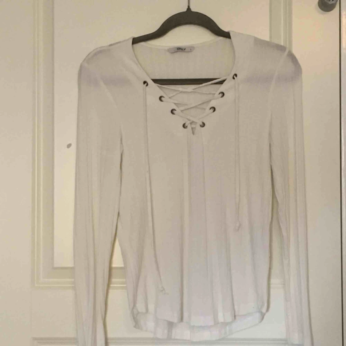 Fin vit, tunn och ribbad tröja från Only. Den har en snörning vid V-ringningen (jättegulligt). Betalning sker via swish💚 Kan mötas upp i Uppsala!
