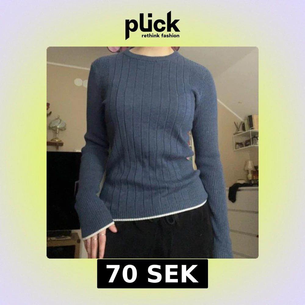 Säljer en blå ribbstickad tröja från River Island i storlek S. Tröjan har rund halsringning, långa ärmar och en smal passform. Perfekt att styla med jeans eller kjol. Diskret vit kant längst ner för en extra detalj.