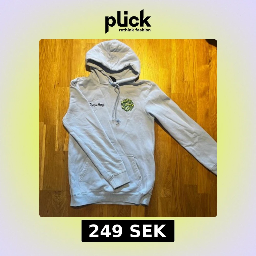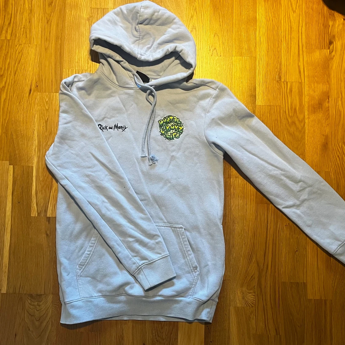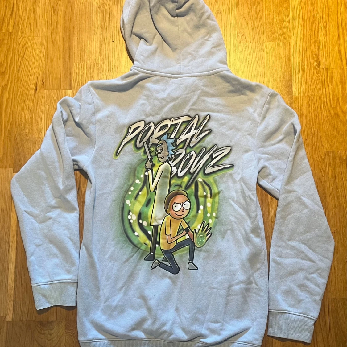 Säljer en hoodie med Rick and Morty-tryck. Framsidan har en liten logga och baksidan har ett stort färgglatt tryck med texten 'Portal Boyz'. Perfekt för fans av serien!