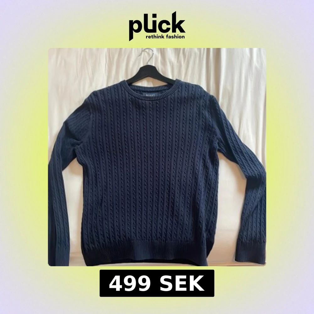 Kabelstickad mörkblå tröja från Riley i klassisk modell med rund halsringning och ribbade muddar. Tröjan har lång ärm och ett snyggt strukturmönster som ger en stilren och tidlös look. Nyskick och sitter väldigt bra!🌟🌟