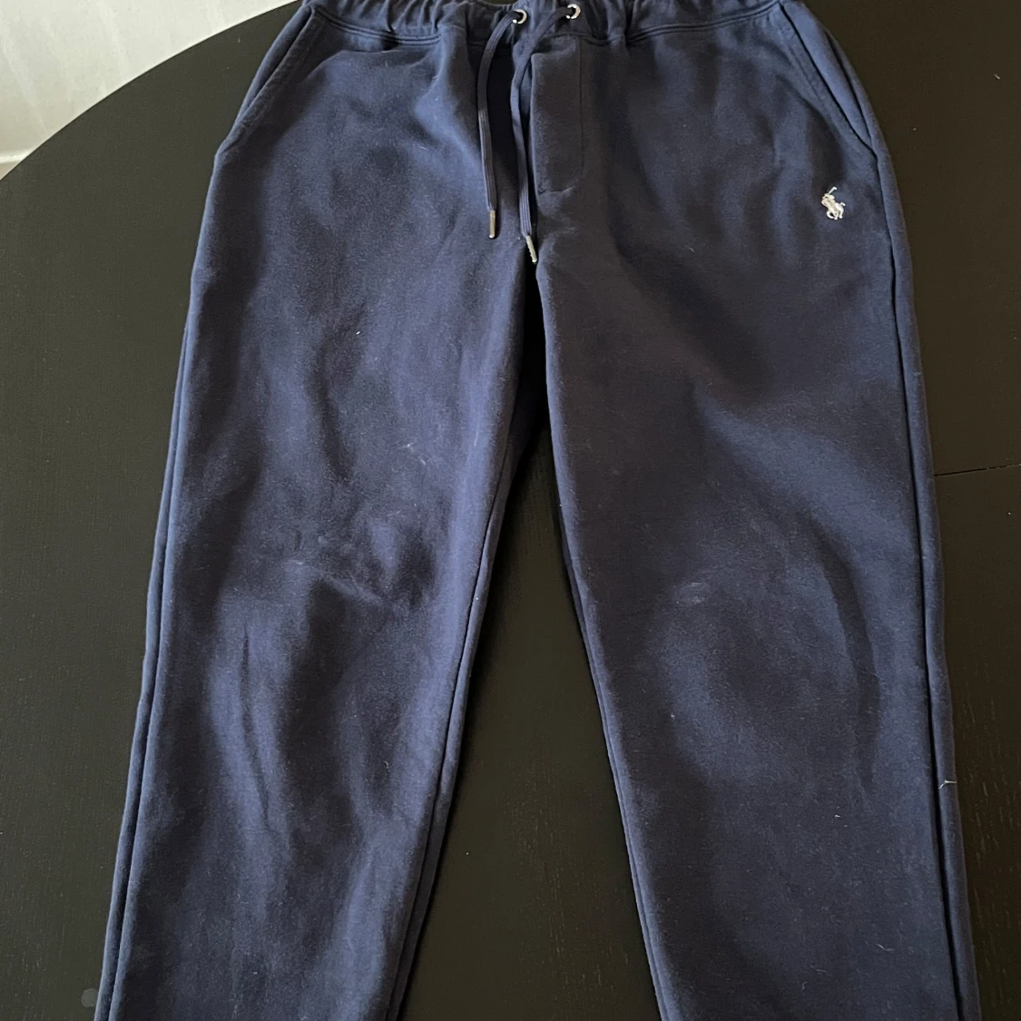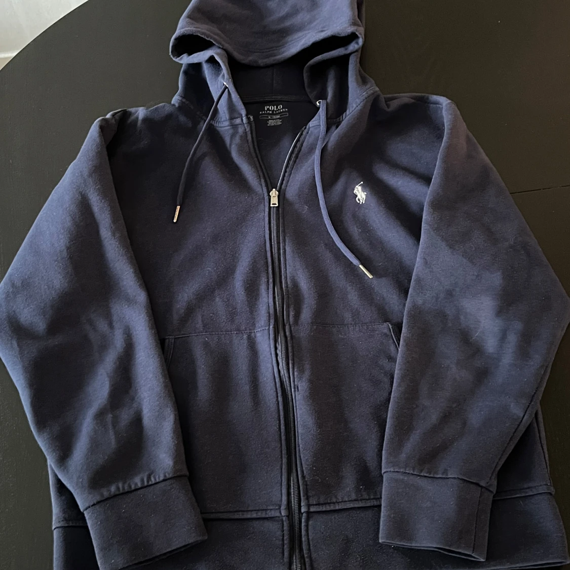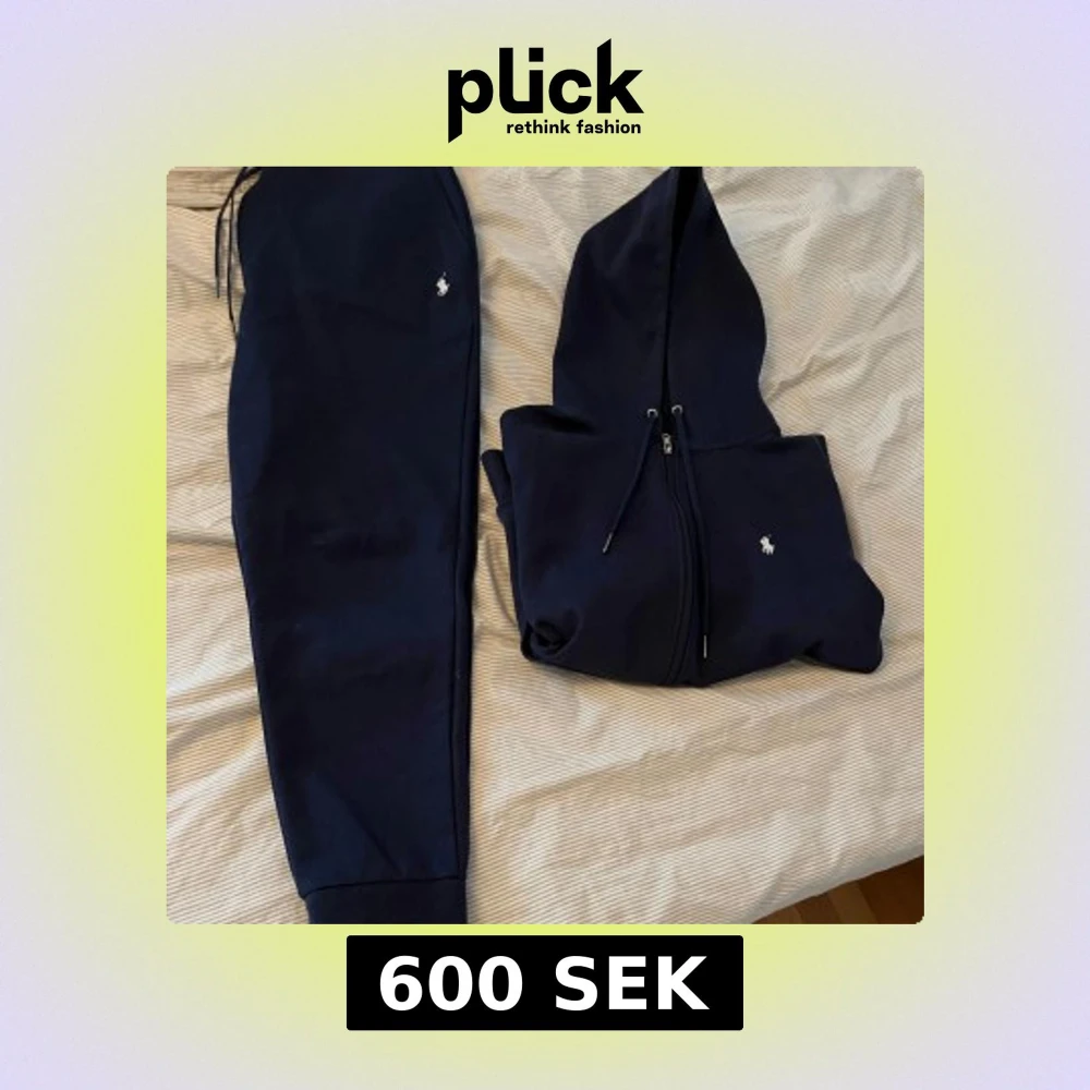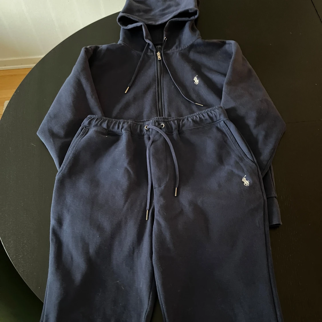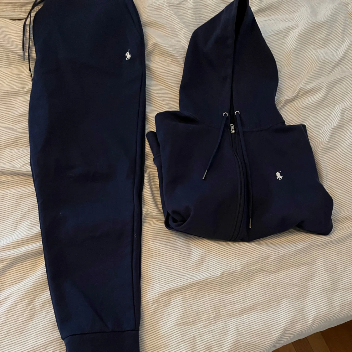 Säljer en snygg mörkblå hoodie med dragkedja och matchande byxor från Ralph Lauren. Båda plaggen har det klassiska Ralph Lauren-logotypen broderad på bröstet och benet. Perfekt för en avslappnad stil. Hör av dig om du endast vill köpa ett av plaggen.