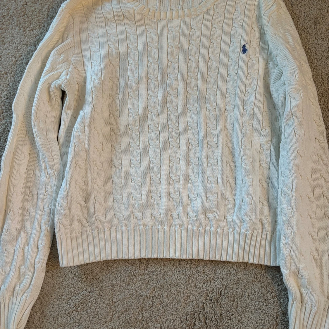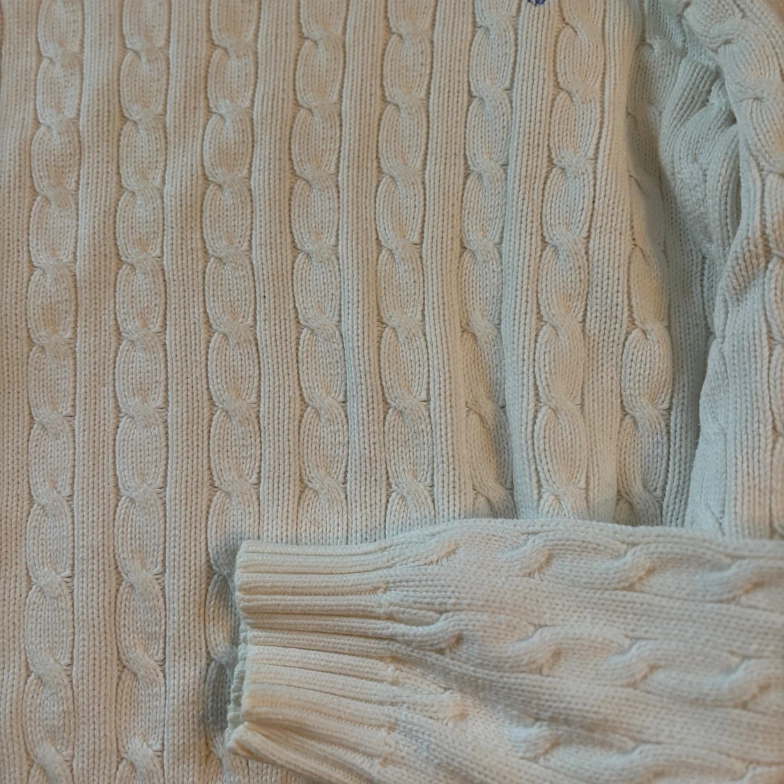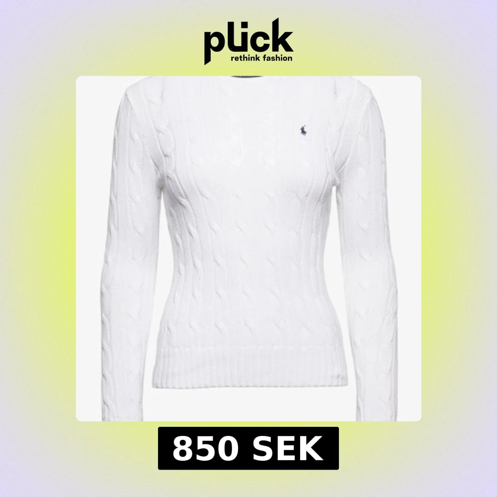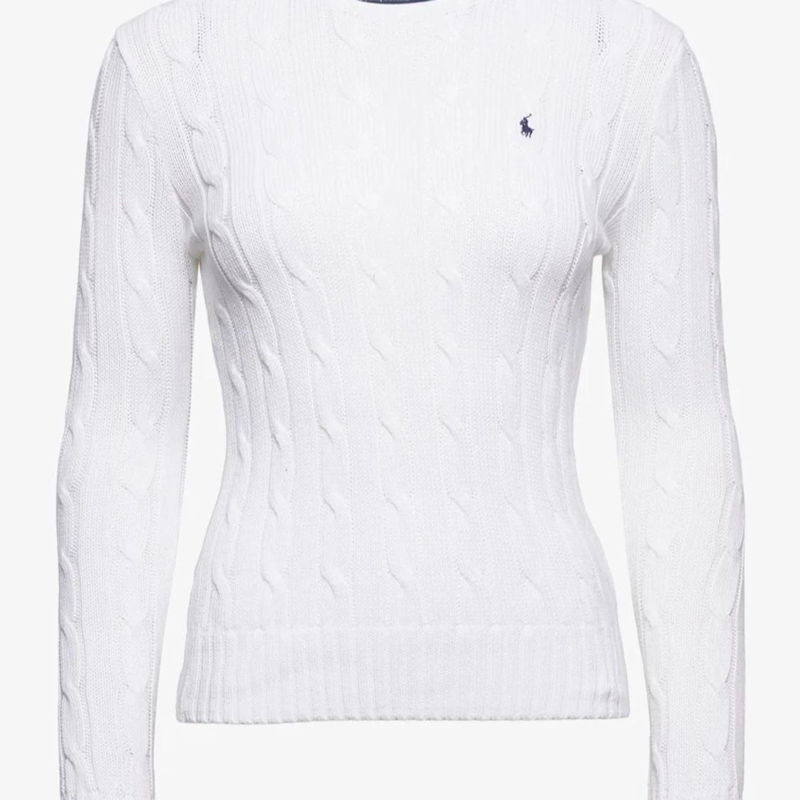 Som ny! Stl XL men skulle säga mer som 38 (M) nypris 2000kr. Vit kabelstickad tröja från Ralph Lauren med klassisk rund hals och långärmad design. Tröjan har det ikoniska blå Polo-logot broderat på bröstet och ribbade muddar vid ärmslut och nederkant. Perfekt för dig som gillar stilren och tidlös look.