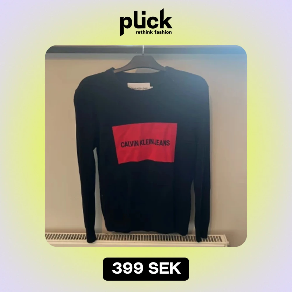 En svart långärmad tröja från Calvin Klein Jeans med en röd rektangel och texten 'CALVIN KLEIN JEANS' på framsidan. Tröjan har en rund halsringning och är tillverkad i ett mjukt material.