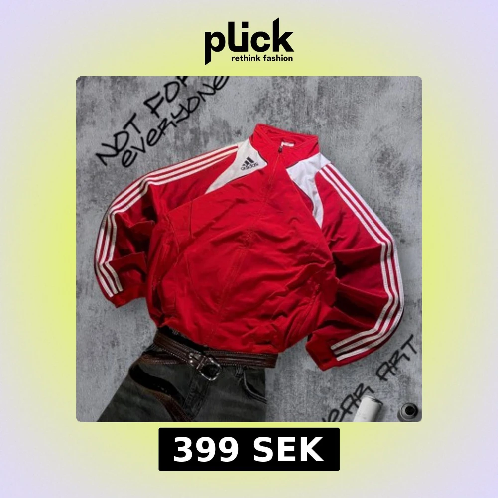 Riktigt snygg röd tröja från Adidas med klassiska vita ränder längs ärmarna och vita paneler på axlarna. Tröjan har dragkedja framtill, hög krage och sportig vibe. Perfekt för dig som gillar streetwear och vill sticka ut med en ikonisk look.