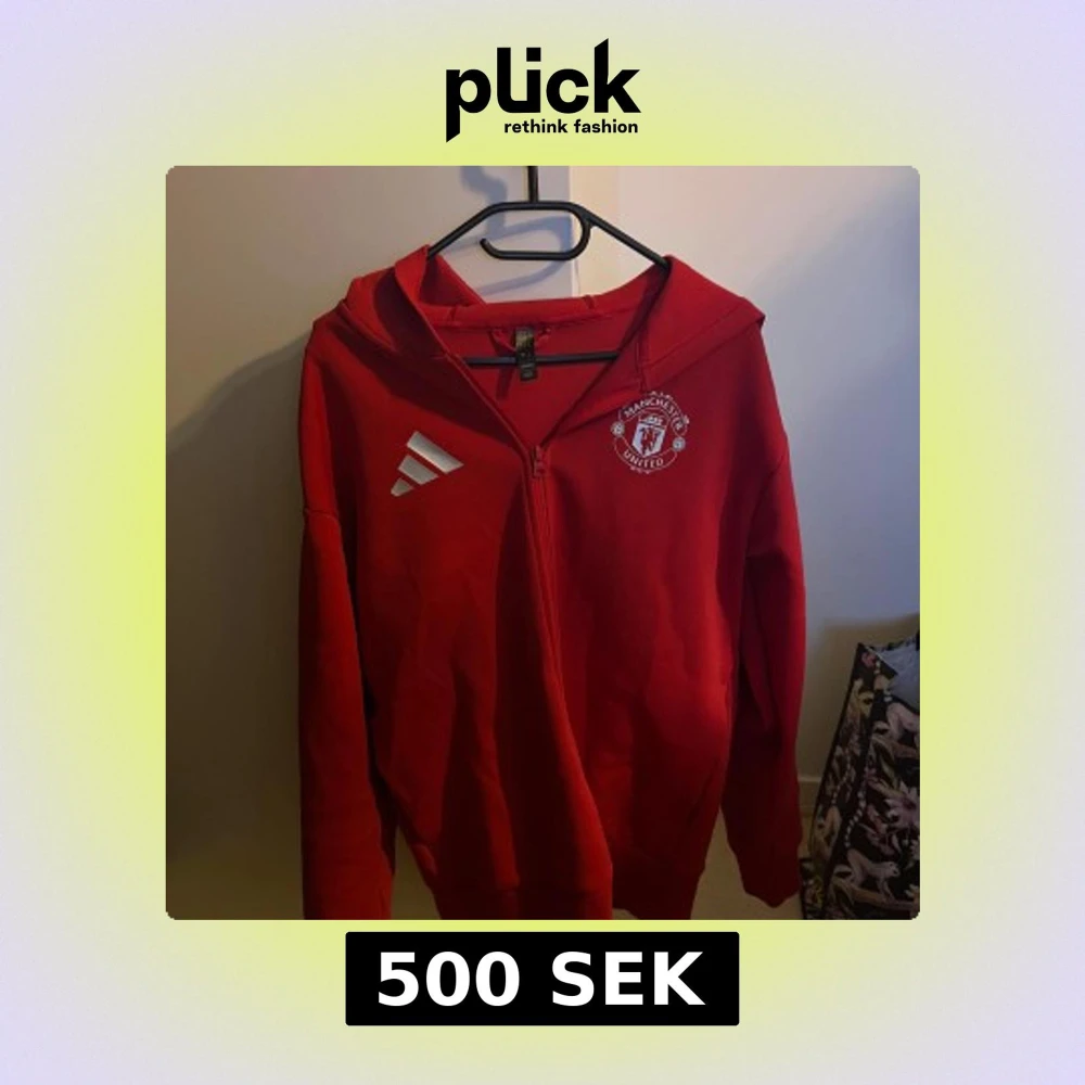 Säljer en röd hoodie från Adidas med Manchester United-logga på bröstet. Tröjan har dragkedja och en stor huva. Perfekt för fotbollsfans som vill visa sitt stöd. Den är tillverkad i ett mjukt material för extra komfort.