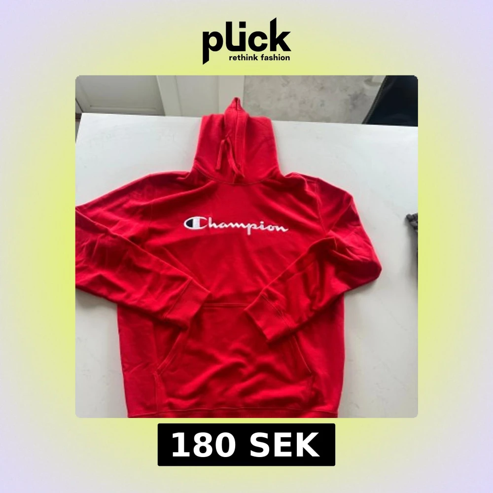 Säljer en snygg röd hoodie från Champion med det klassiska logotyptrycket på bröstet. Tröjan har en känguruficka och justerbar huva med dragsko. Perfekt för en avslappnad stil.