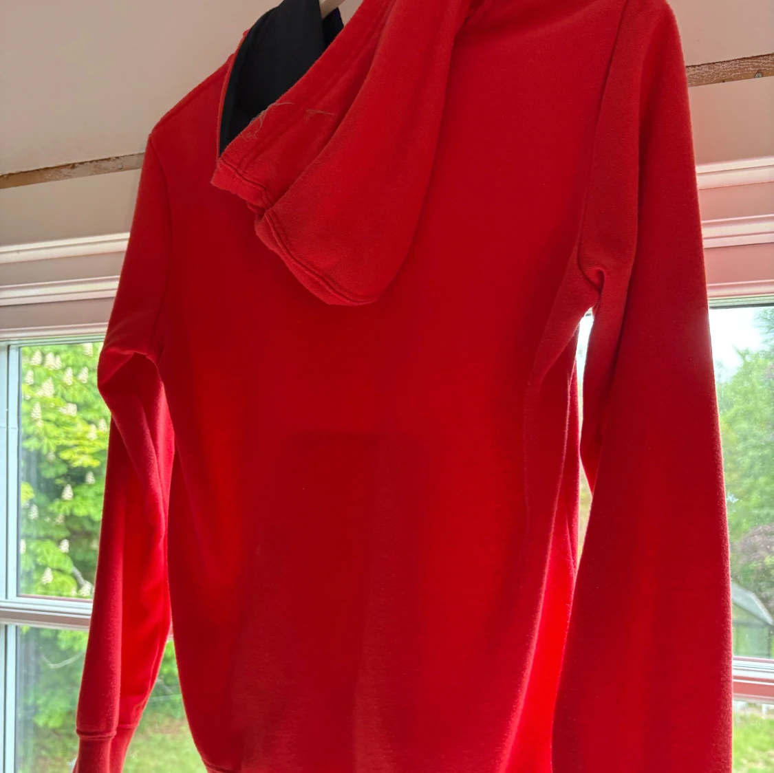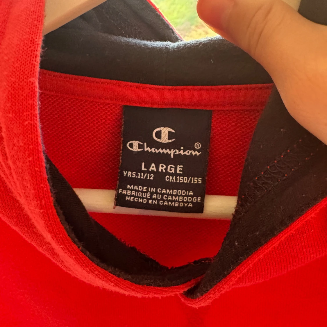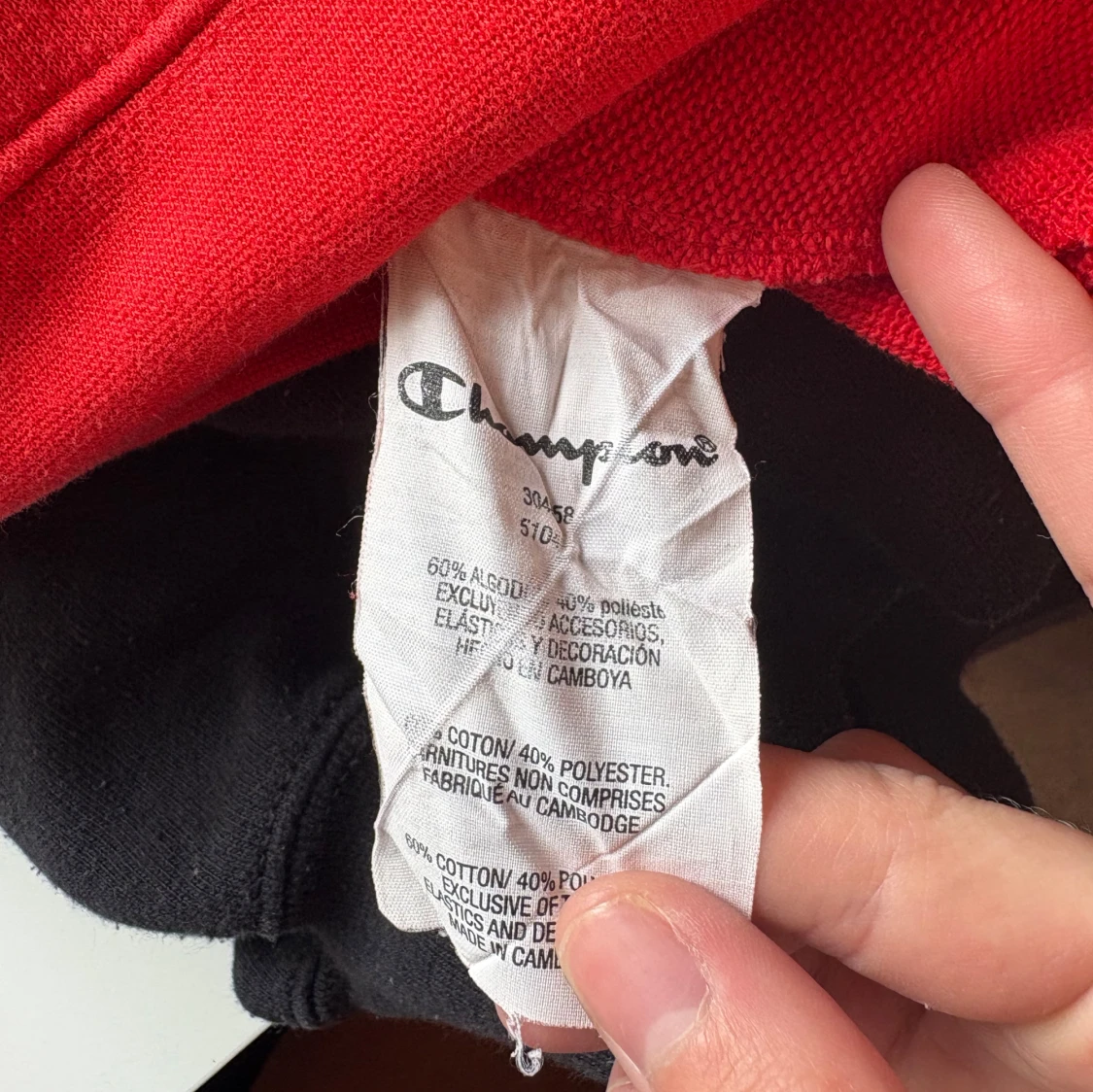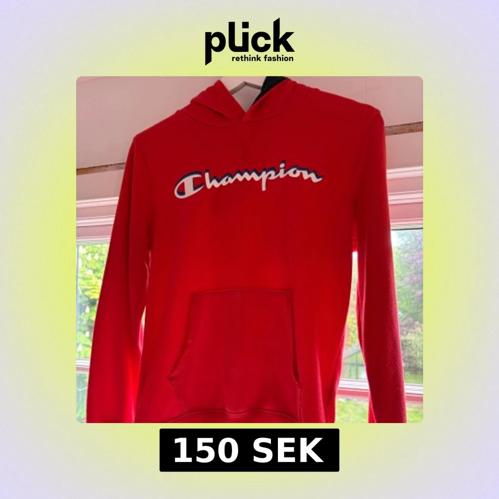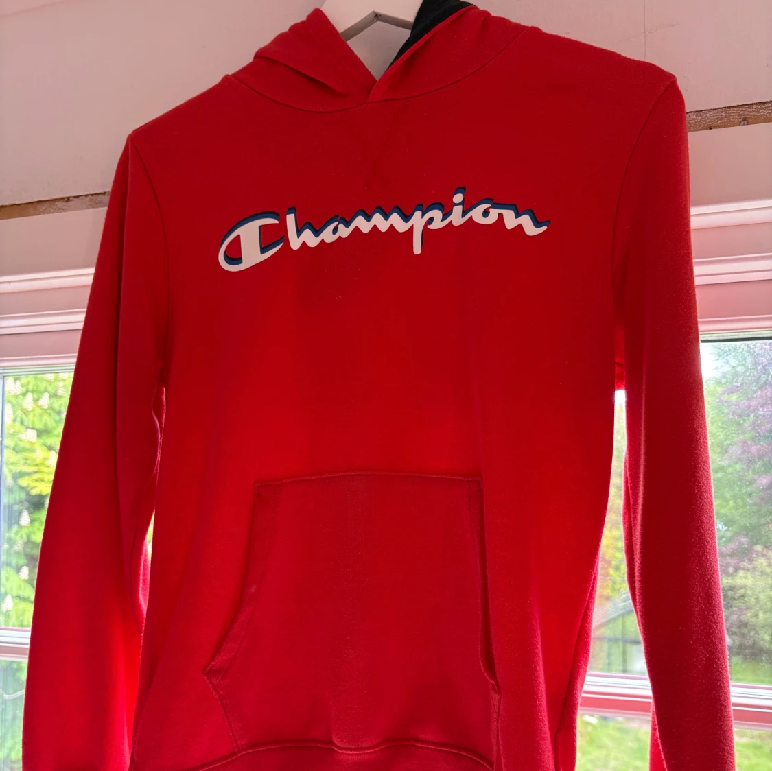 Röd hoodie från Champion med vit och blå logga på bröstet. Tröjan har känguruficka framtill och huva med svart innerfoder. Tillverkad i bomull och polyester, perfekt för en avslappnad stil.
