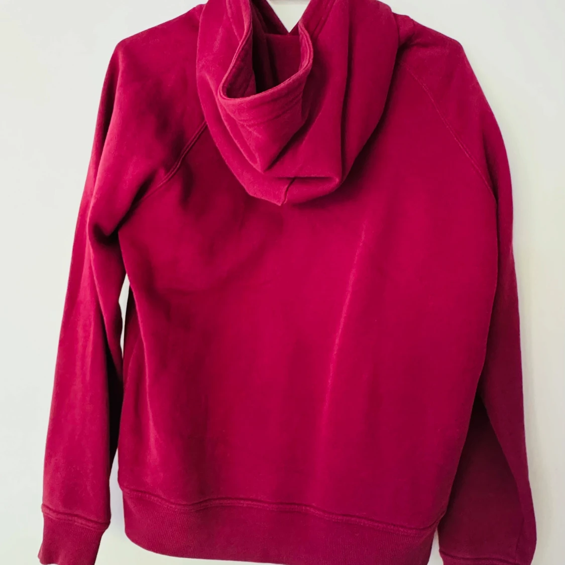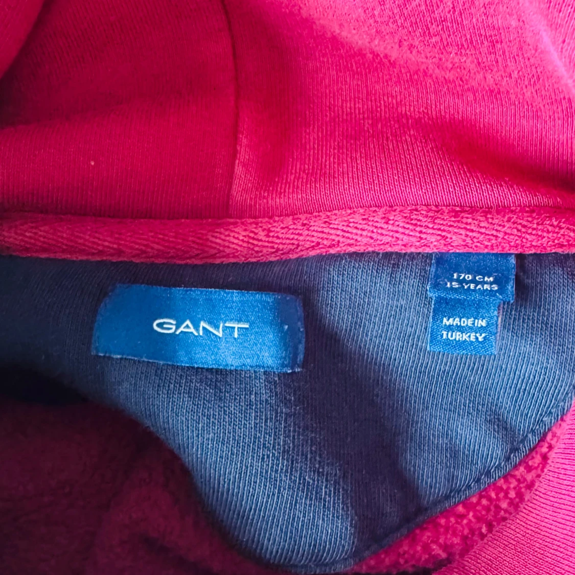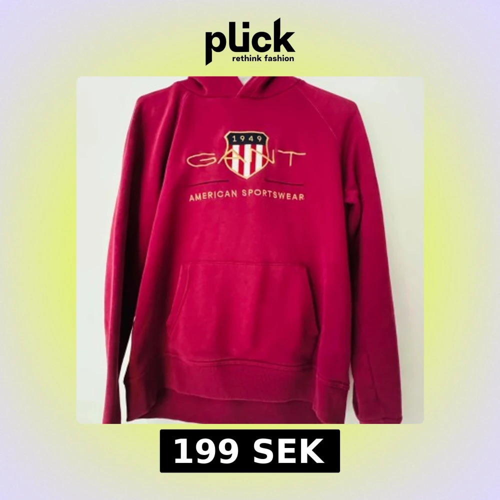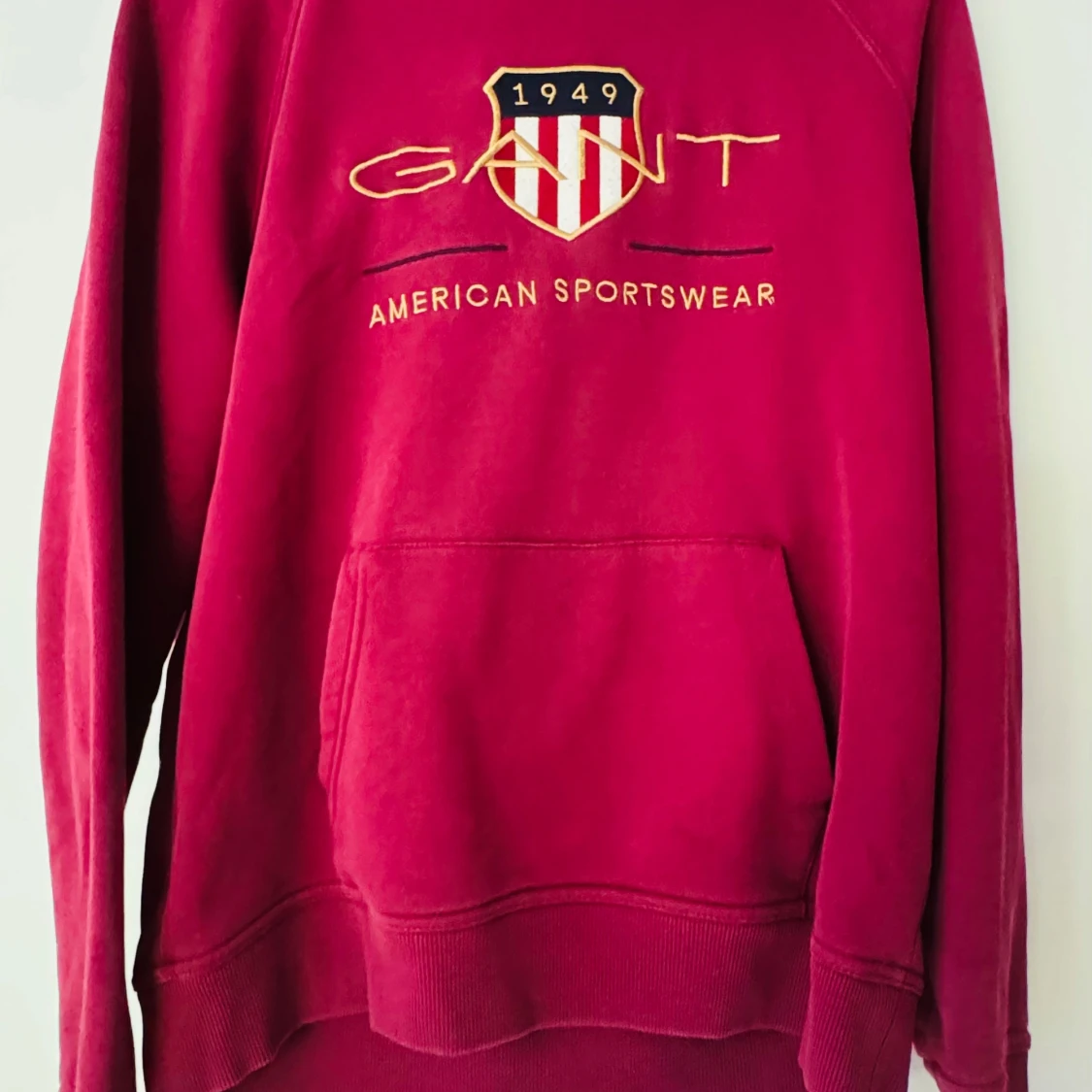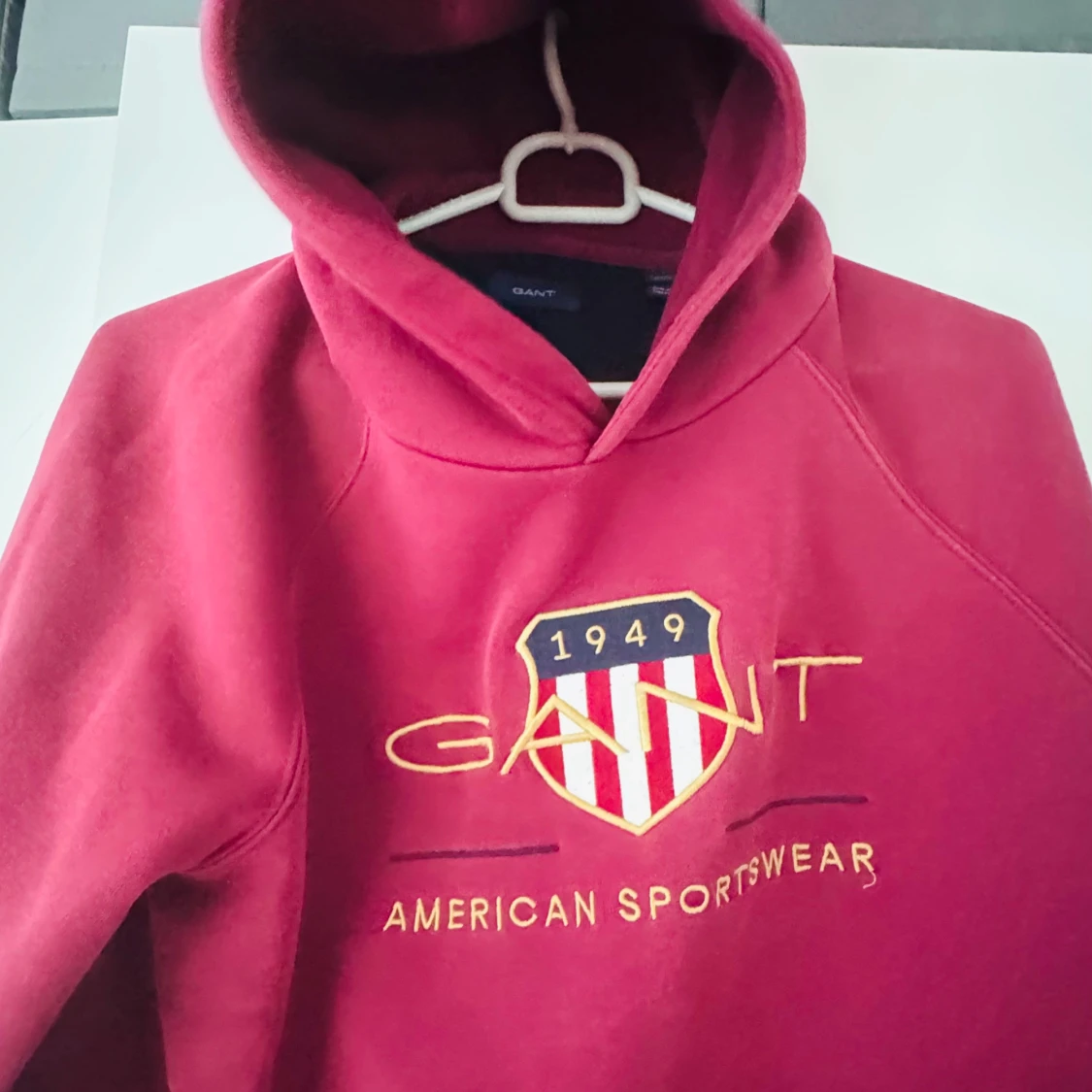 Säljer en röd hoodie från Gant med broderad logga och texten 'American Sportswear' framtill. Tröjan har huva och en stor magficka. Perfekt för dig som gillar klassisk och sportig stil.
