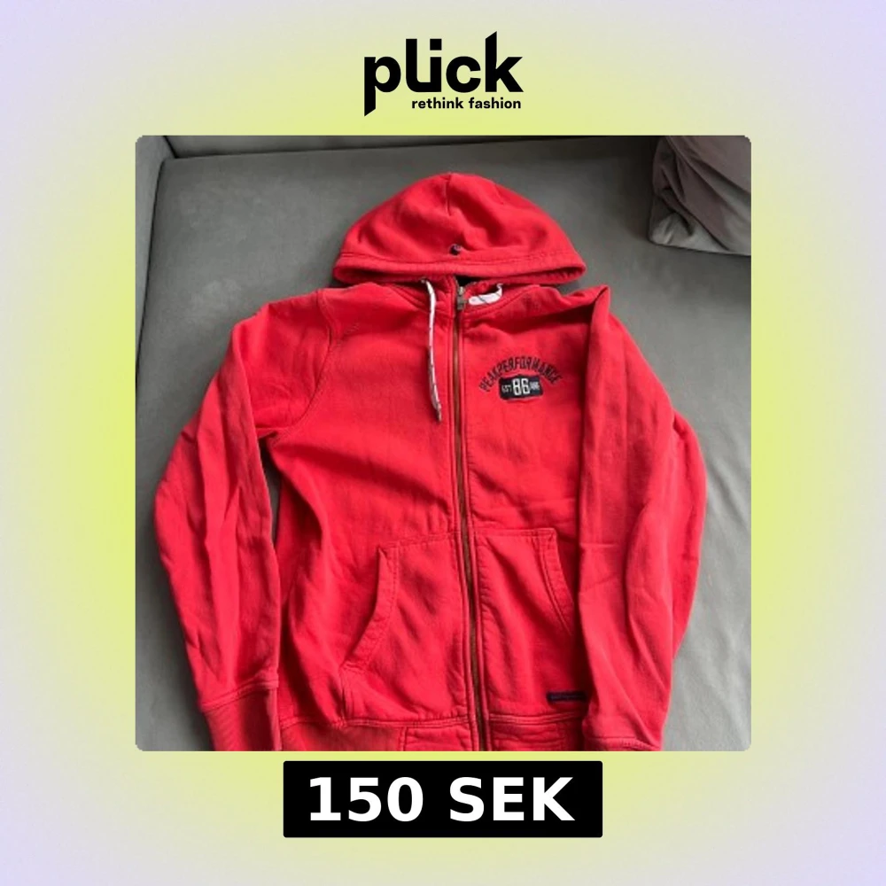 Röd hoodie från Peak Performance med dragkedja, huva med snörning och broderad logga på bröstet. Mjuk bomullskänsla och två stora fickor framtill. Perfekt för en avslappnad och sportig stil.