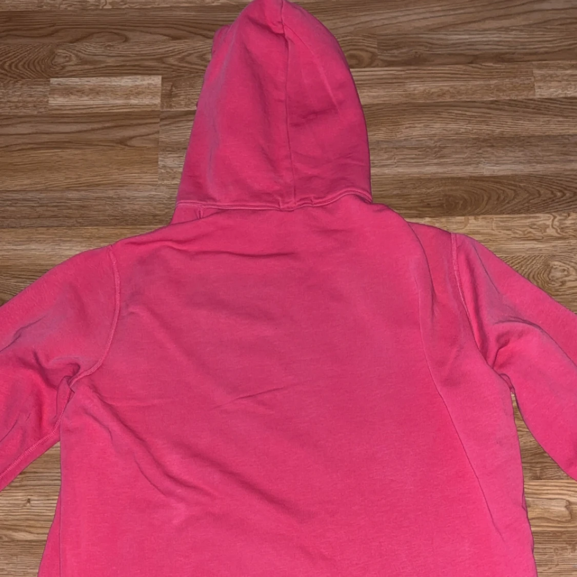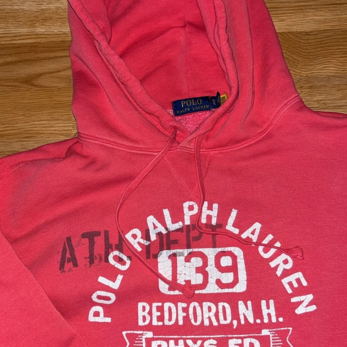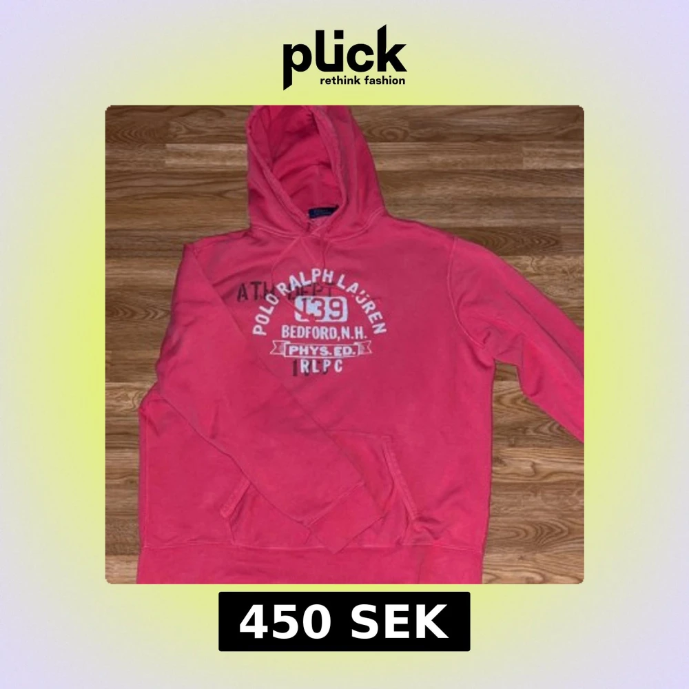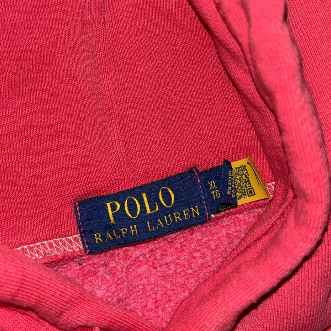 Snygg röda hoodie från Polo Ralph Lauren i storlek XL. Tröjan har vit tryckt text och siffror framtill, klassisk huva med snörning och en stor magficka. Perfekt för dig som gillar sportig och avslappnad stil.