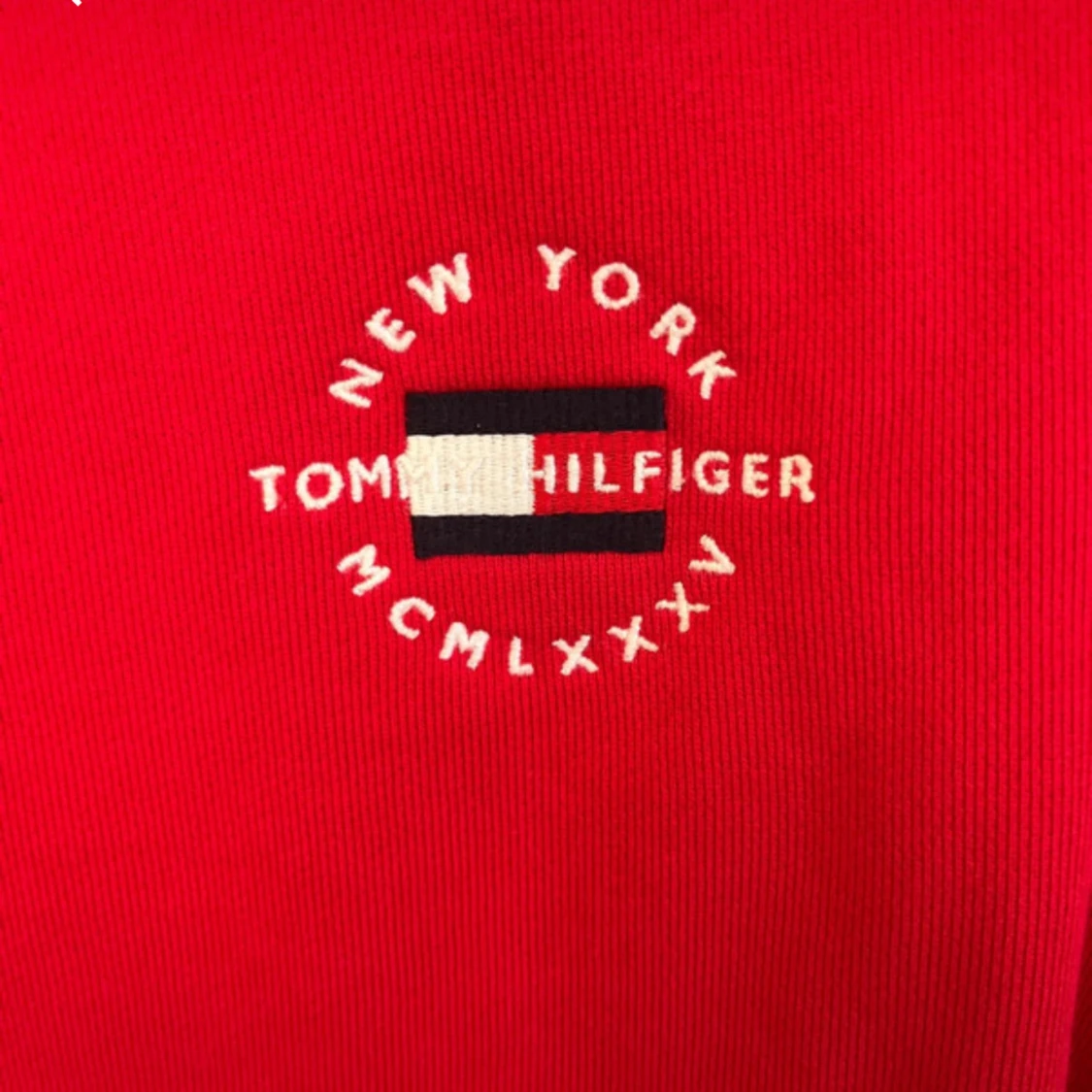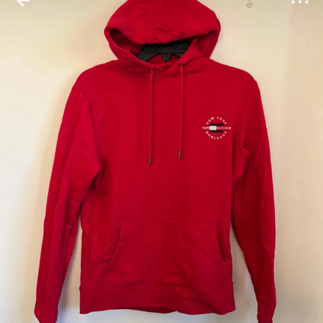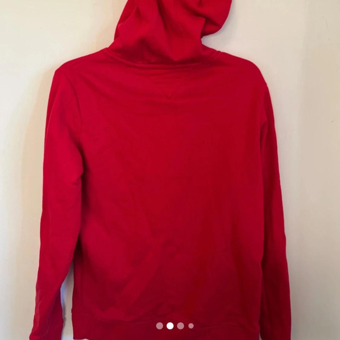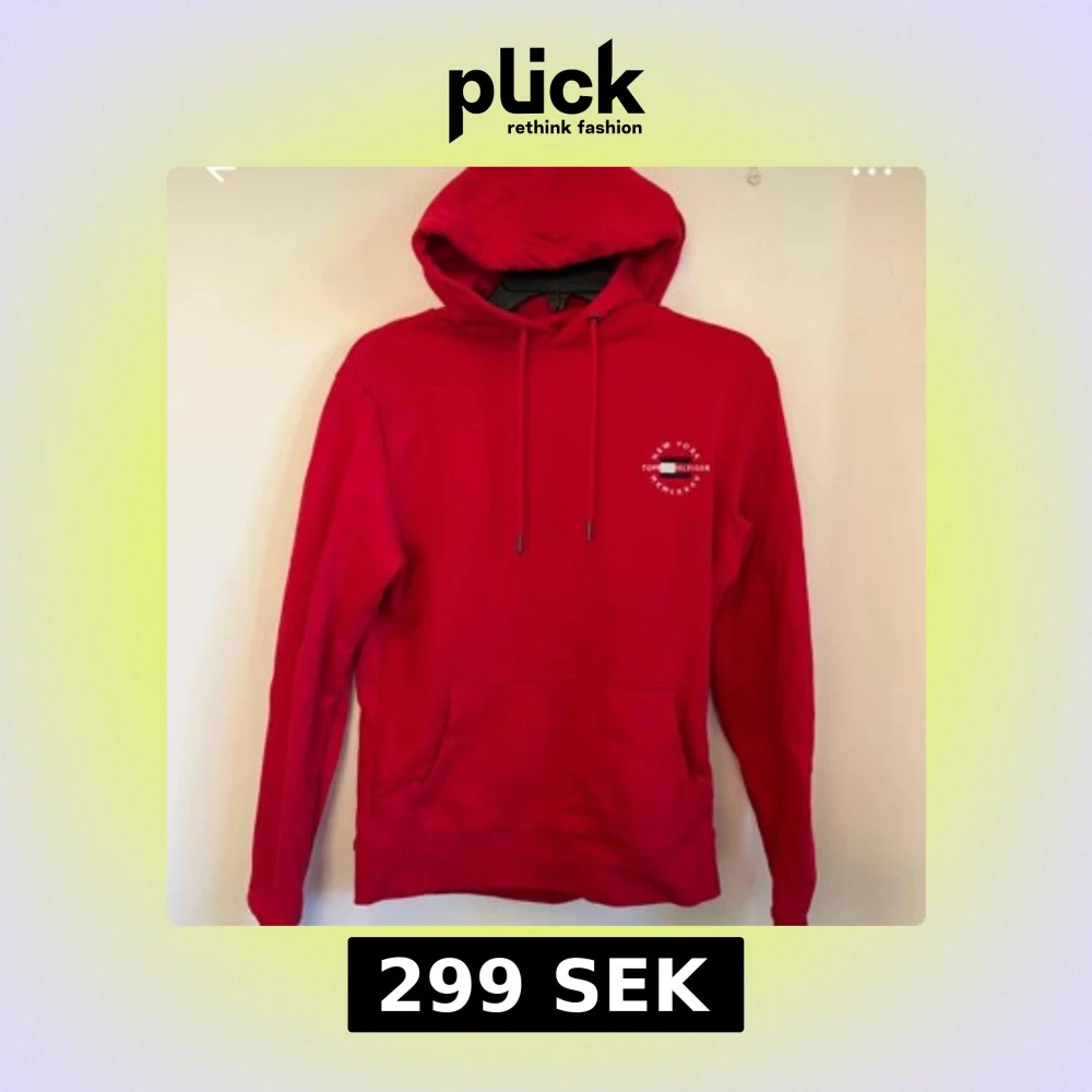 Säljer en röd hoodie från Tommy Hilfiger med broderad logga och text på bröstet. Tröjan har huva med dragsko och en stor magficka. ANVÄND EN GÅNG, nypris =1100 kr mitt = 149 kr skriv om minsta lilla fundering!