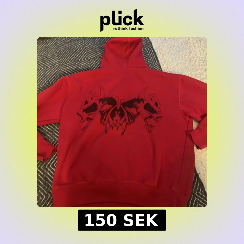 Säljer en röd hoodie från D-Way med ett stort svart tryck av två döskallar och en fjäril på ryggen. Tröjan har huva och ribbade muddar. Perfekt för dig som gillar unika och lite edgy plagg!