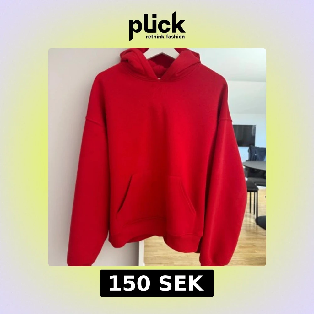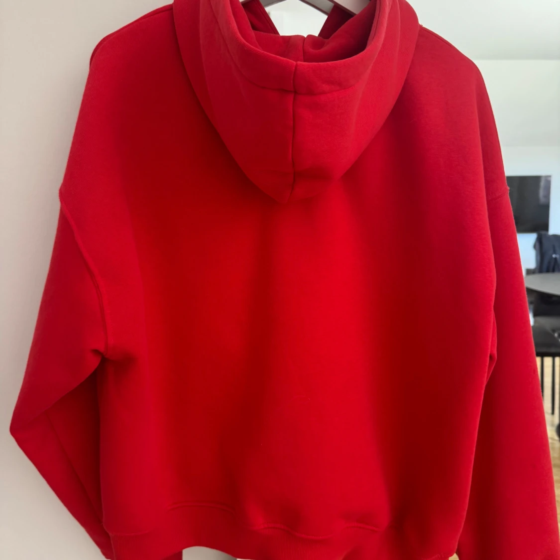 Säljer en klassisk röd hoodie med huva och stor magficka framtill. Tröjan har en avslappnad passform och är perfekt för en chill stil. Passar lika bra till jeans som till mjukisbyxor.