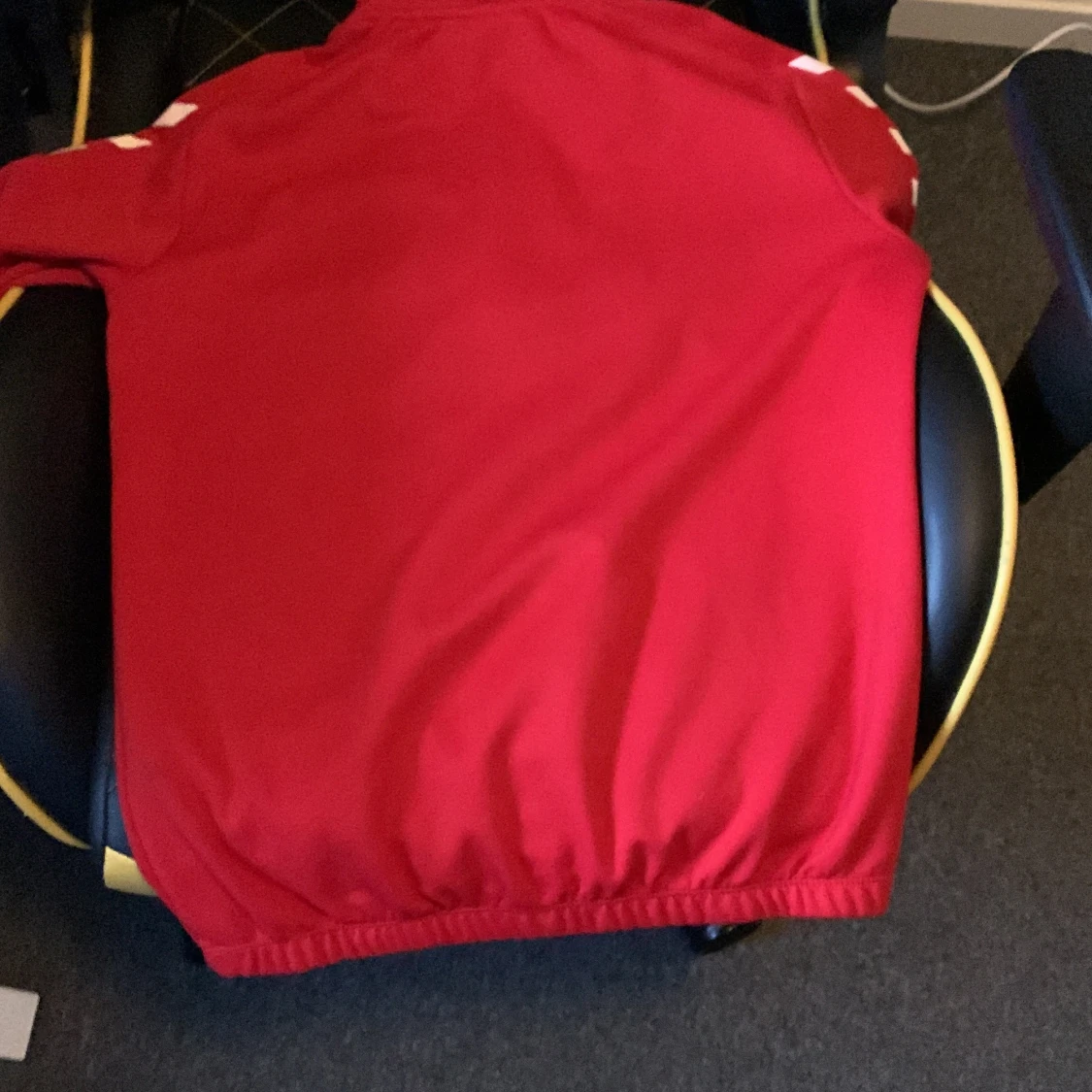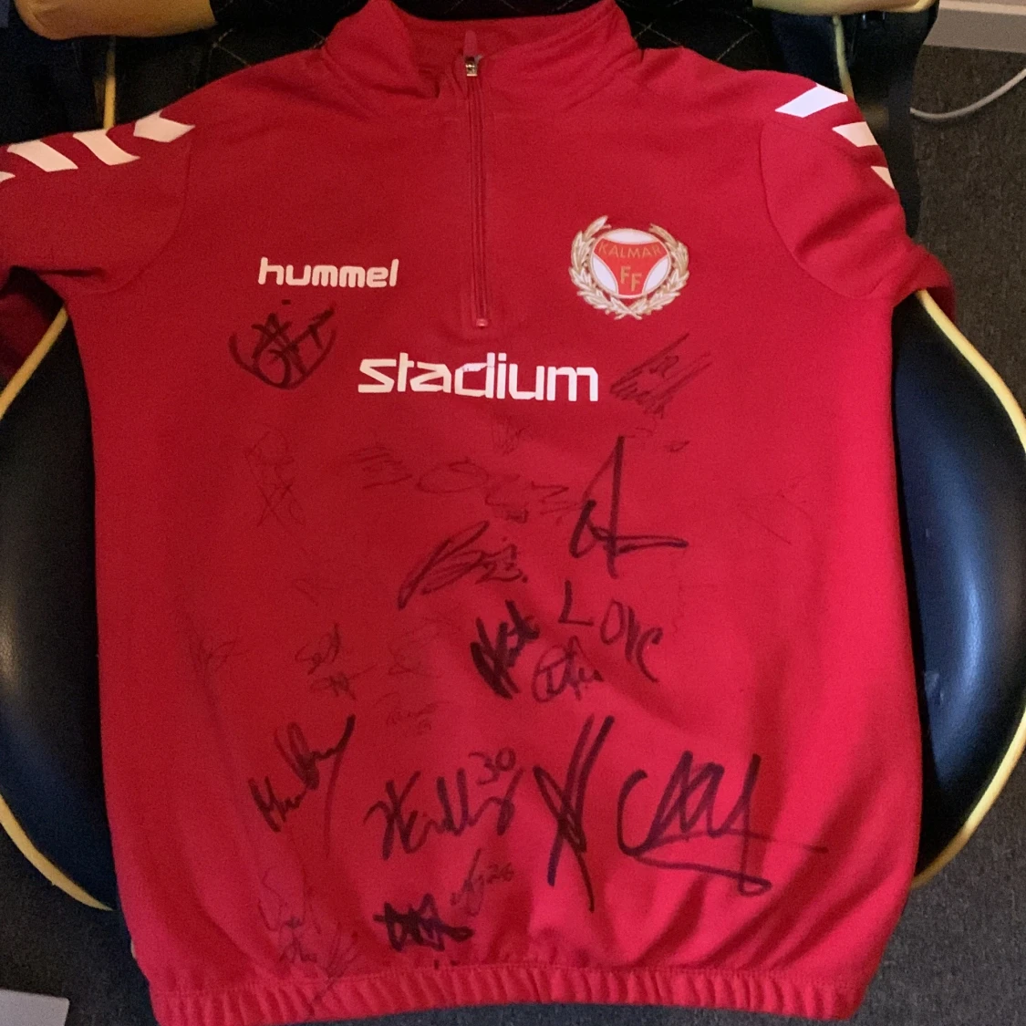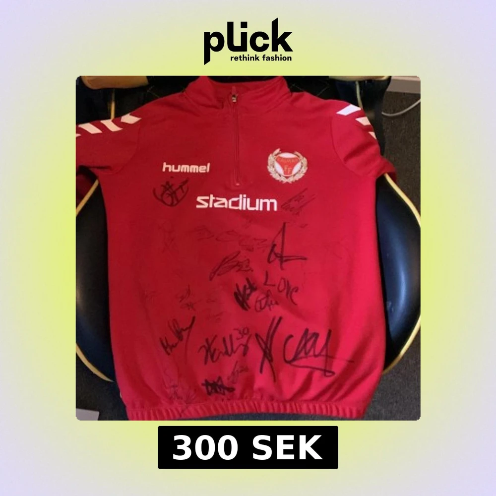 Röd sporttröja från Hummel med Kalmar FF-logga och flera autografer på framsidan. Tröjan har half zip, lång ärm och vita detaljer på axlarna. Perfekt för fotbollsfans som vill ha något unikt från sitt favoritlag.