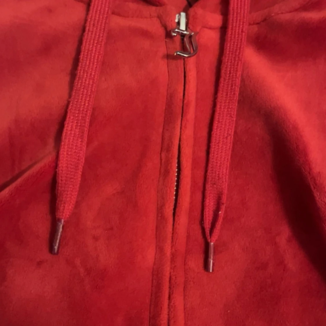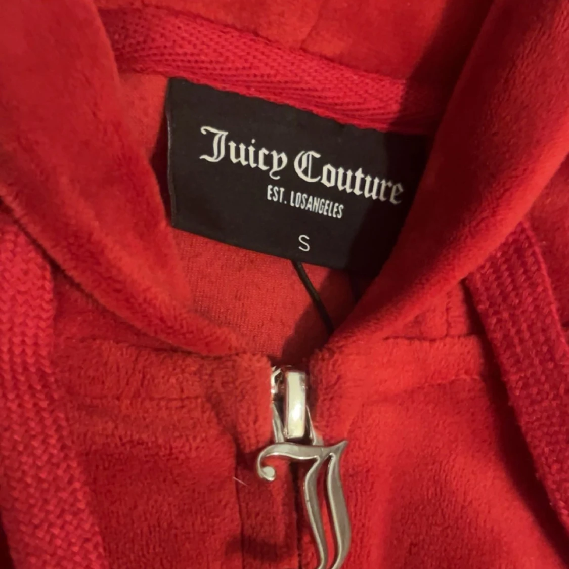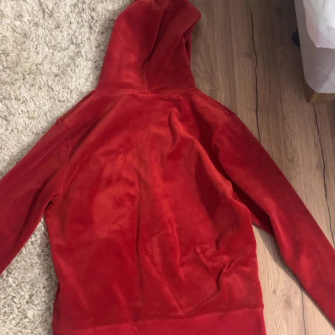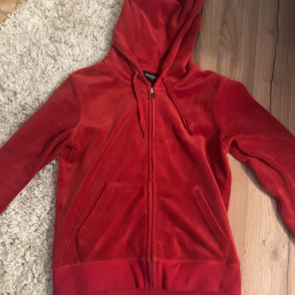 Säljer min Juicy Couture hoodie i färgen Astor Red. Fint skick det ända är att de silvriga grejerna som ska sitta längst ner på snörena har ramlat av (finns en tydlig bild på vad jag menar) ny pris 1200❤️