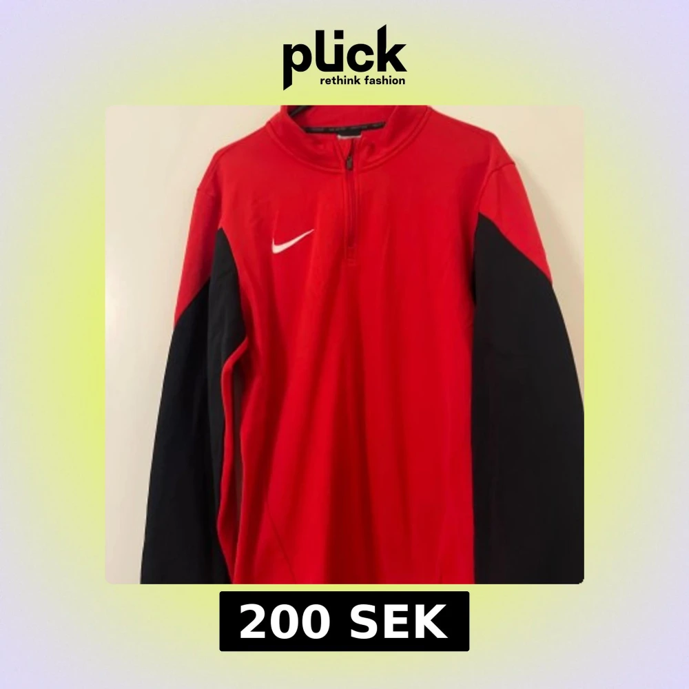 Röd långärmad Nike Dri-Fit tröja med svarta ärmar och vit logga på bröstet. Tröjan har en half zip-dragkedja vid halsen och är tillverkad i ett lätt och funktionellt material som passar perfekt för träning eller sport.