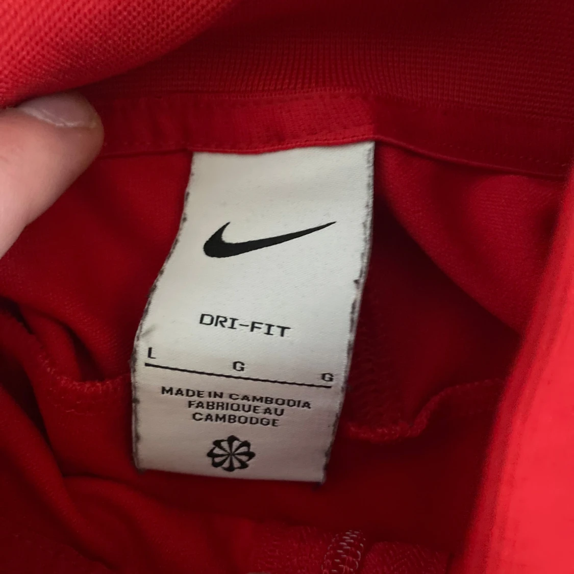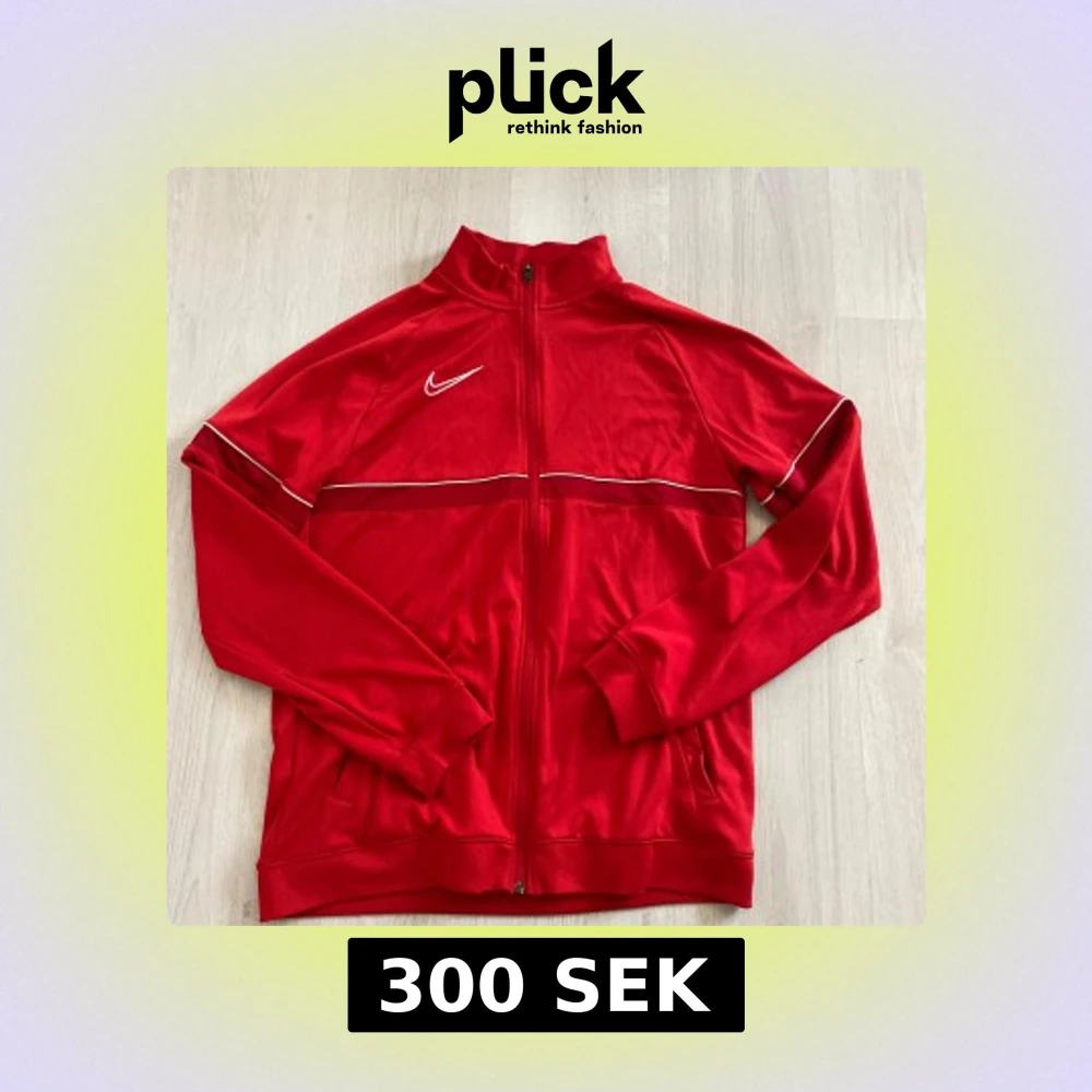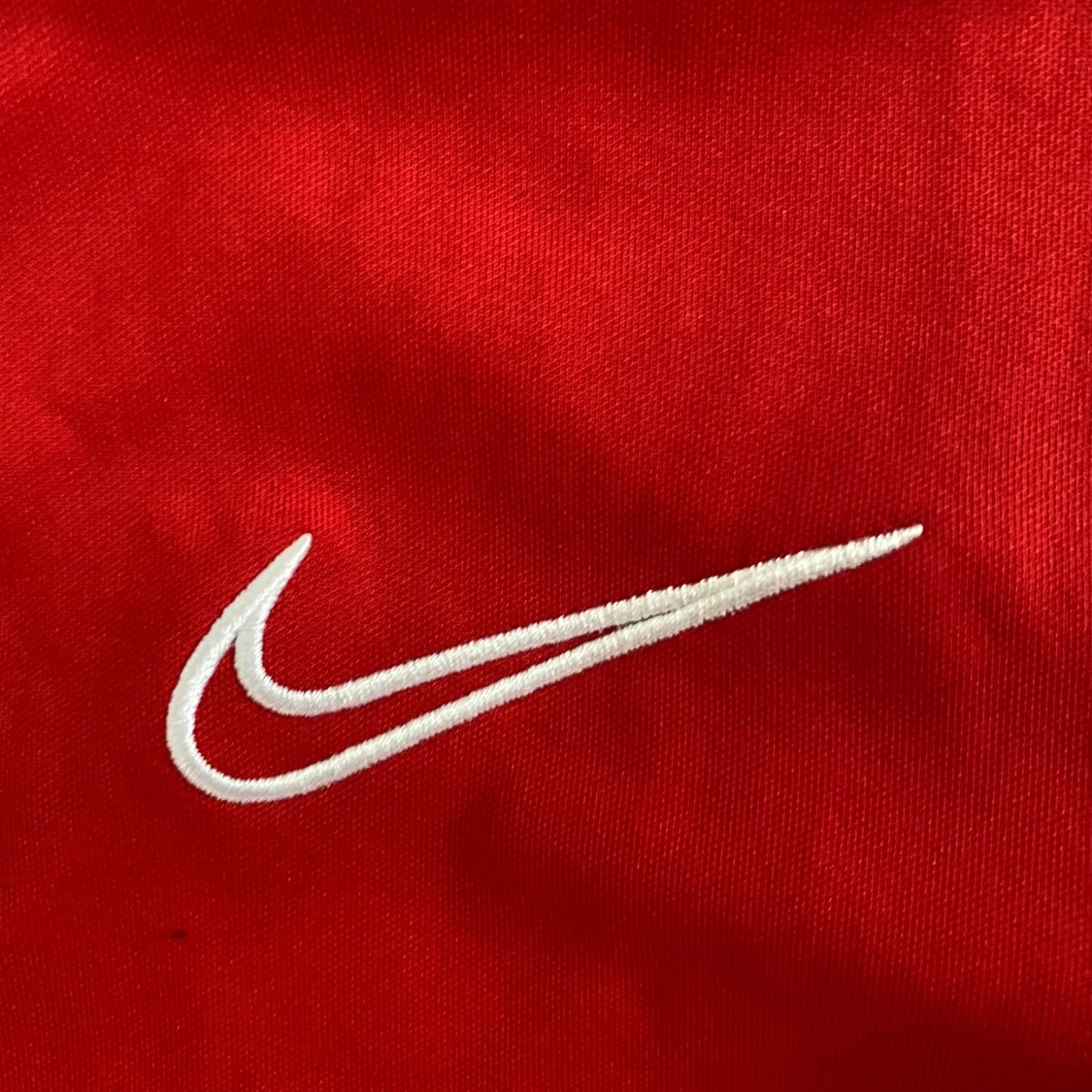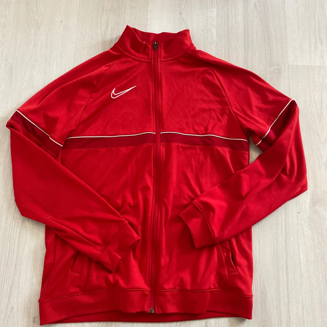 Riktigt snygg röd träningsjacka från Nike med vit broderad swoosh på bröstet och diskreta vita detaljer längs ärmarna. Koftan har hel dragkedja, hög krage och är tillverkad i Dri-Fit polyester som andas. Perfekt för sport eller chill vardagsstil.