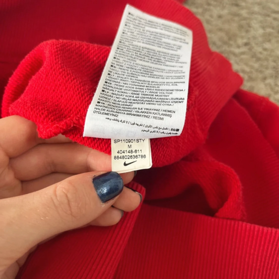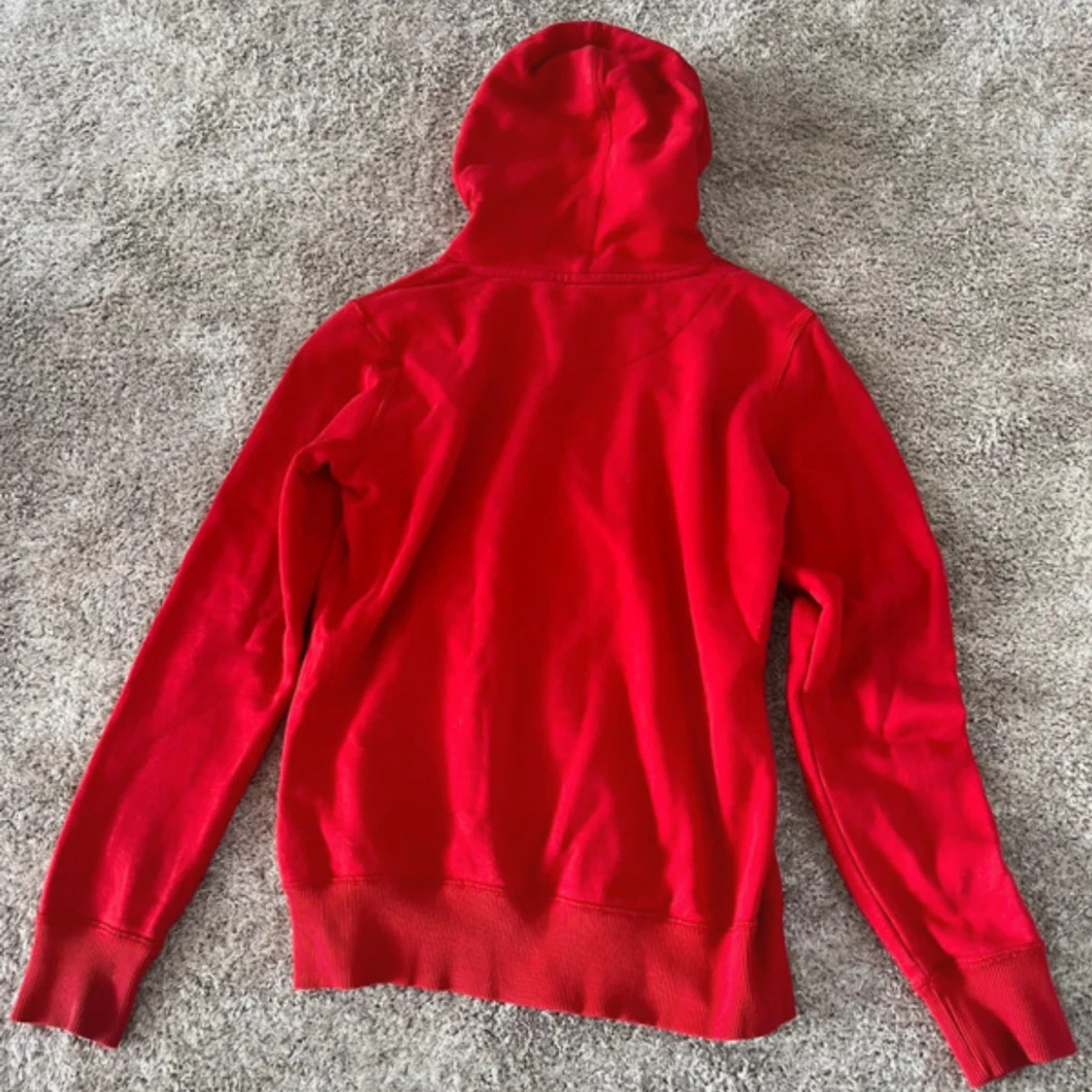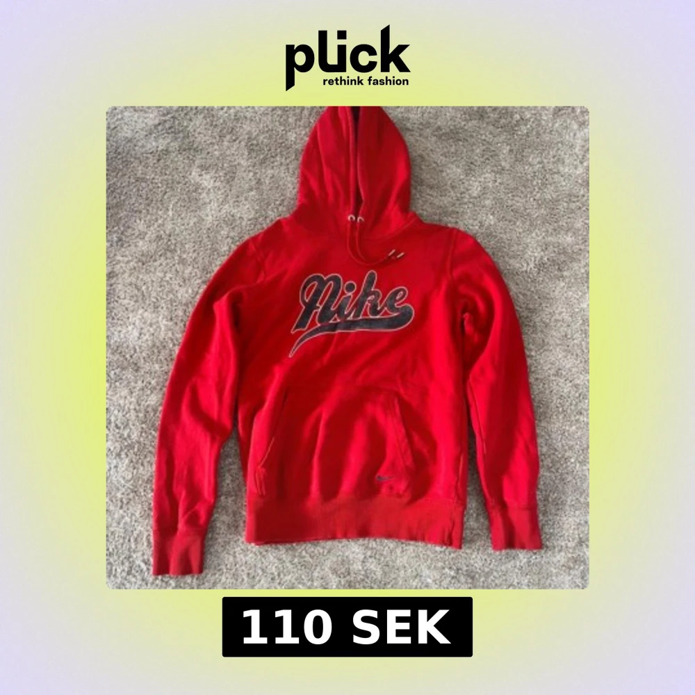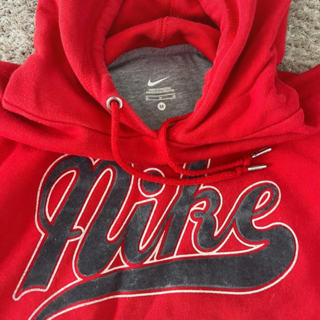 Riktigt snygg röd hoodie från Nike med stor broderad logga i svart och vitt på bröstet. Tröjan har huva med snörning, känguruficka och är tillverkad i mjuk bomullsmix. Den är liten i storleken och skulle kunna vara en s.