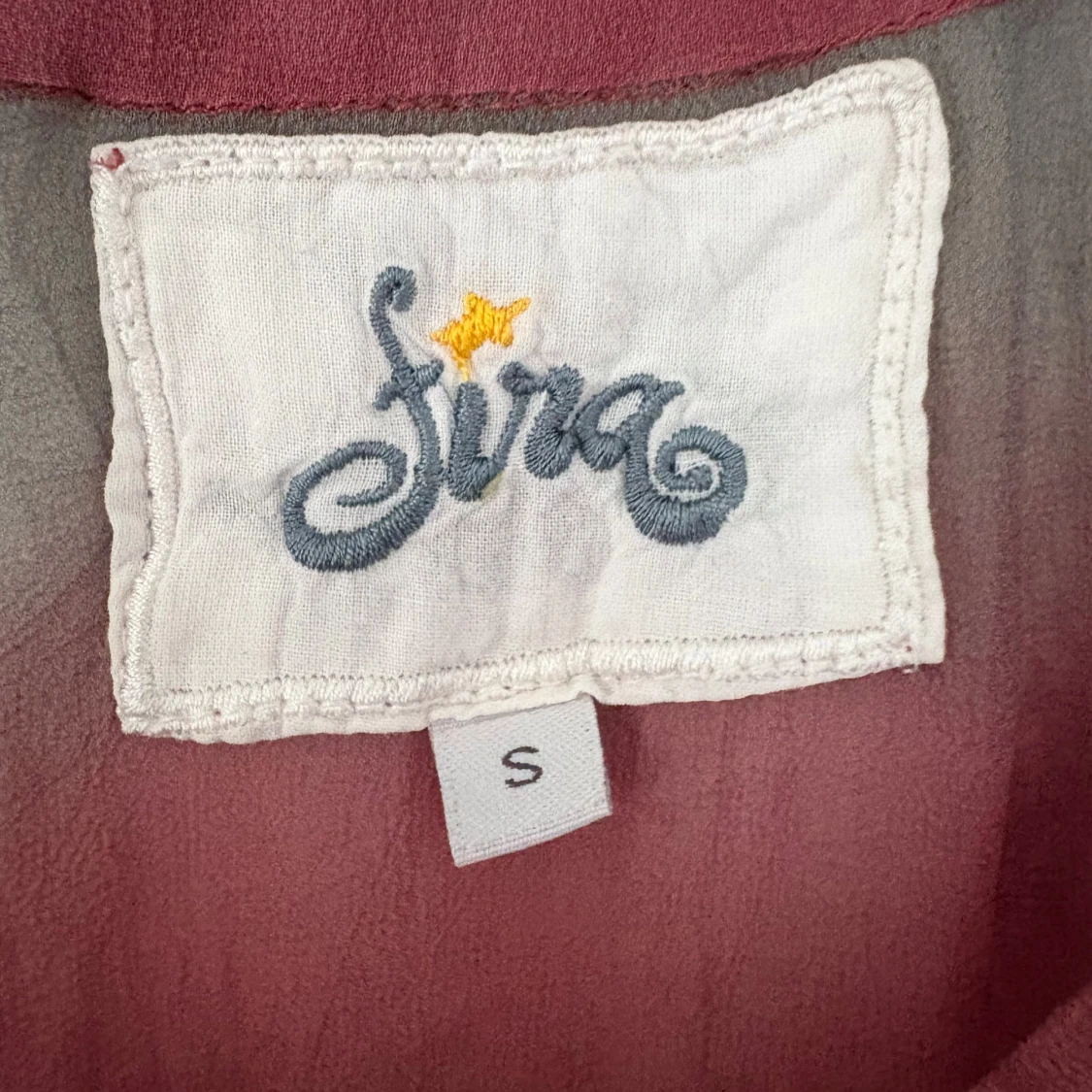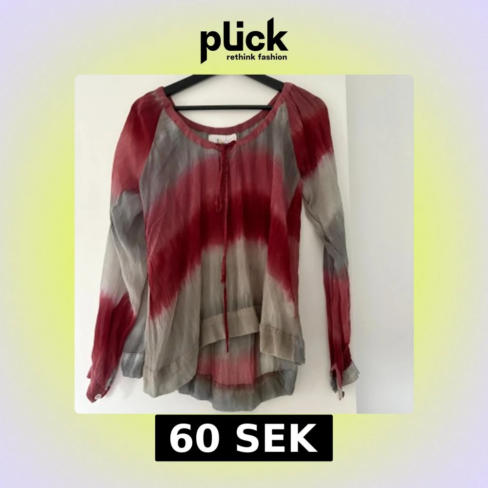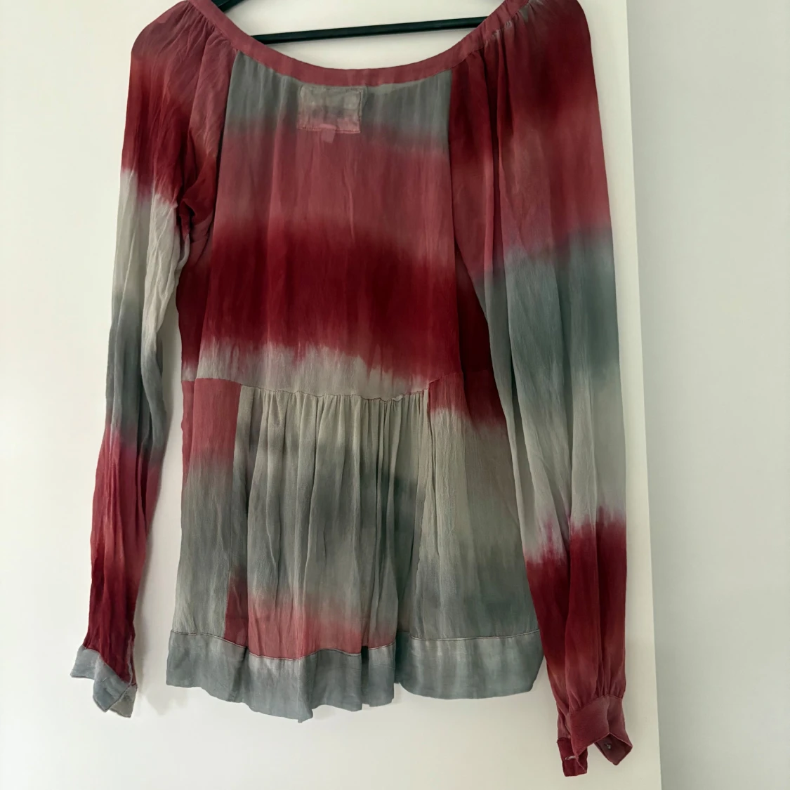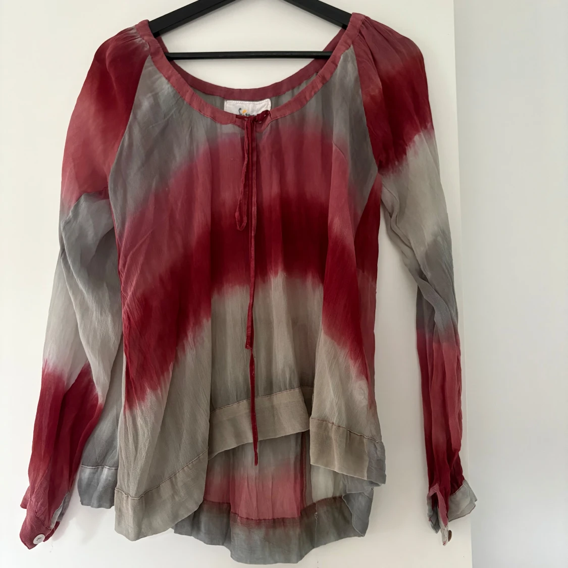 Säljer en luftig blus från Fira i storlek S. Blusen har ett batikmönster i rött och grått, långa ärmar och knytning vid halsen. Materialet känns tunt och flowy