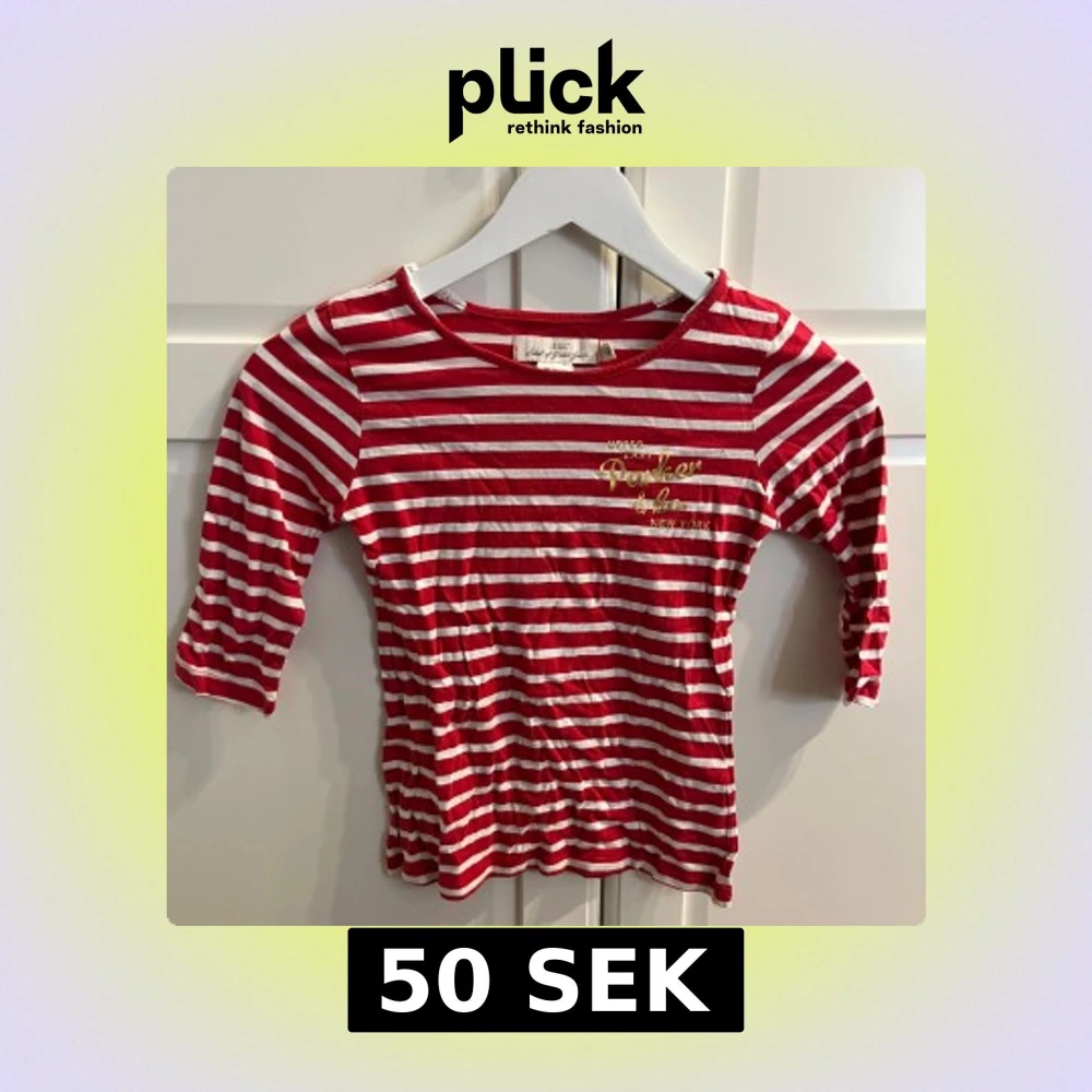 Säljer en söt röd- och vitrandig topp från H&M med texten 'Upper East Parker & Co. New York' i guld på bröstet. Toppen har trekvartsärmar och är perfekt för en avslappnad stil. Passar bra till jeans eller kjol för en trendig look.