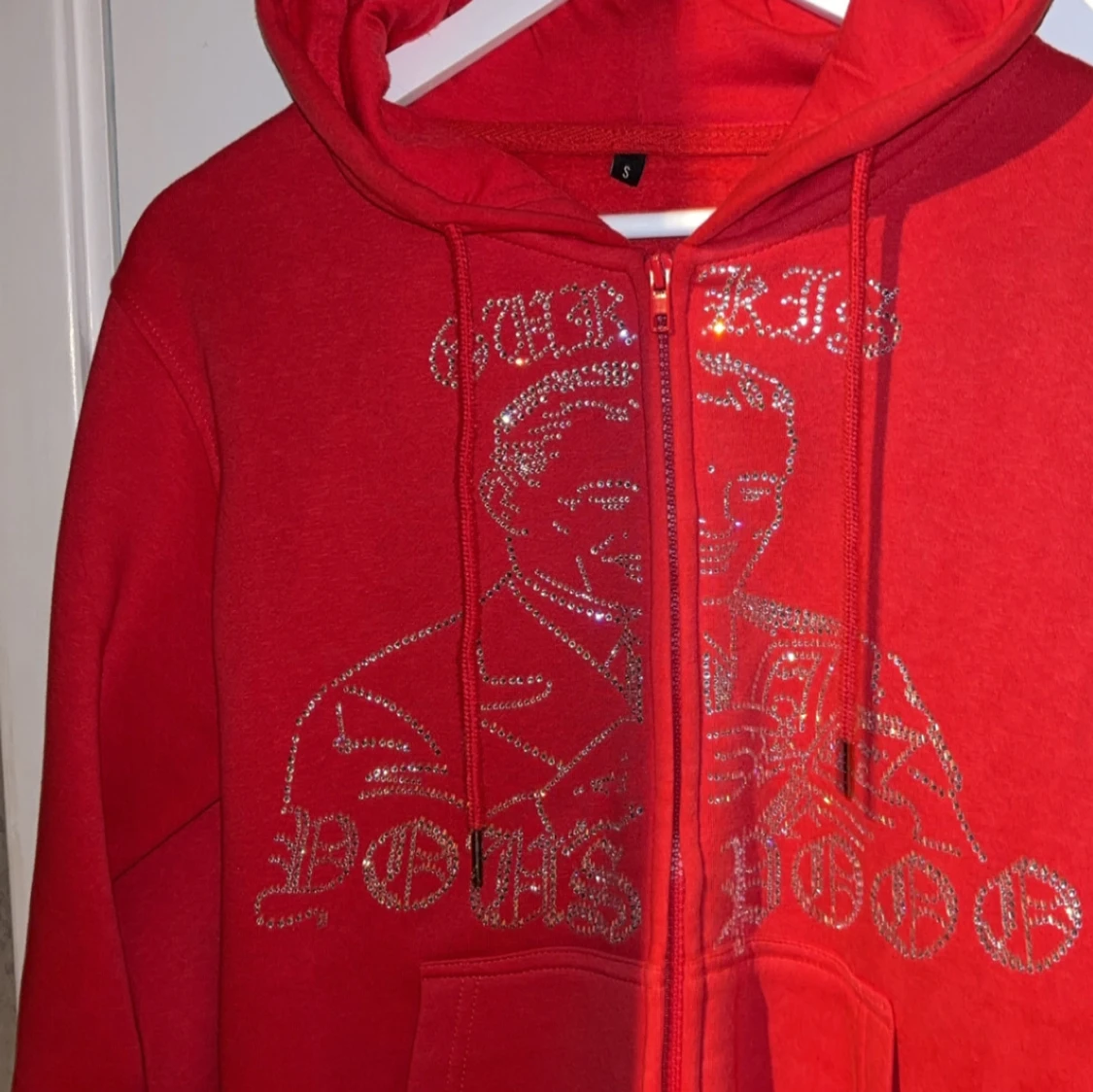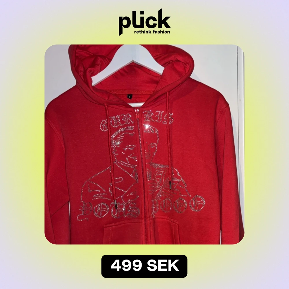 Röd rhinestone hoodie i storlek small! Den är i nyskick. Skriv om du har några frågor!