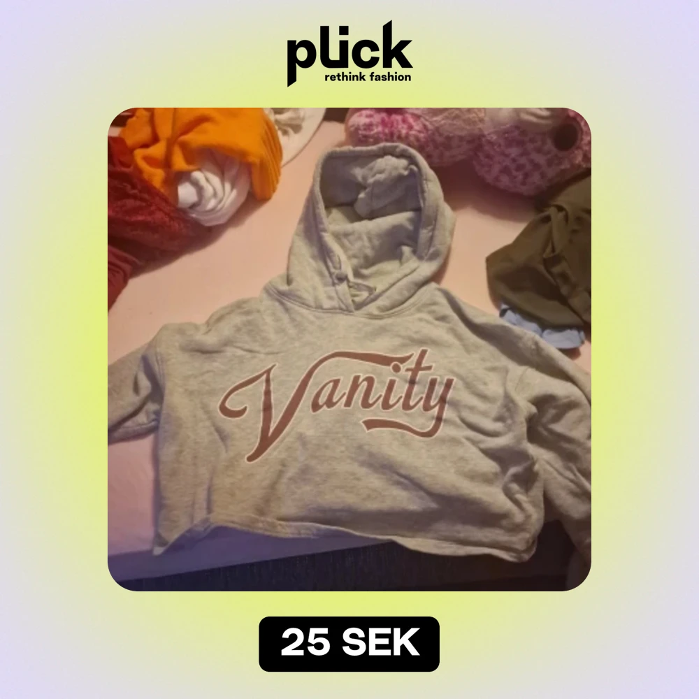 Säljer en supermjuk och skön grå hoodie med texten 'Vanity' i rödbrun färg på framsidan. Den är croppad och har en stor, mysig huva. Perfekt för en avslappnad stil eller att mysa i hemma. Passar perfekt till jeans eller leggings!