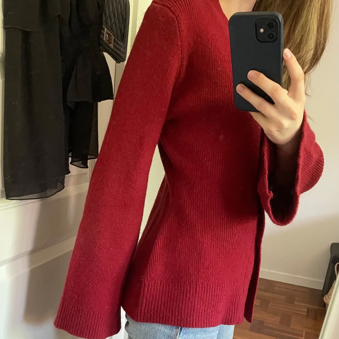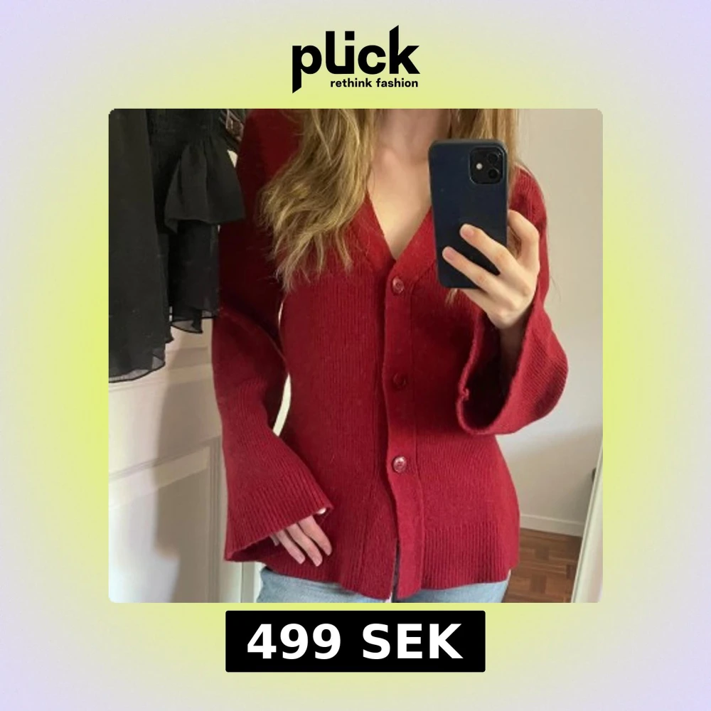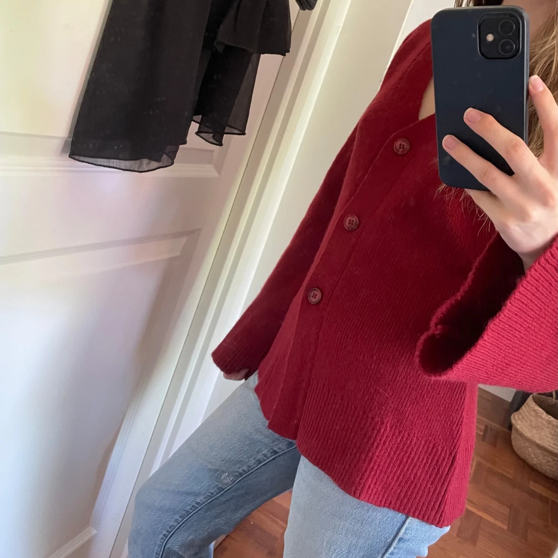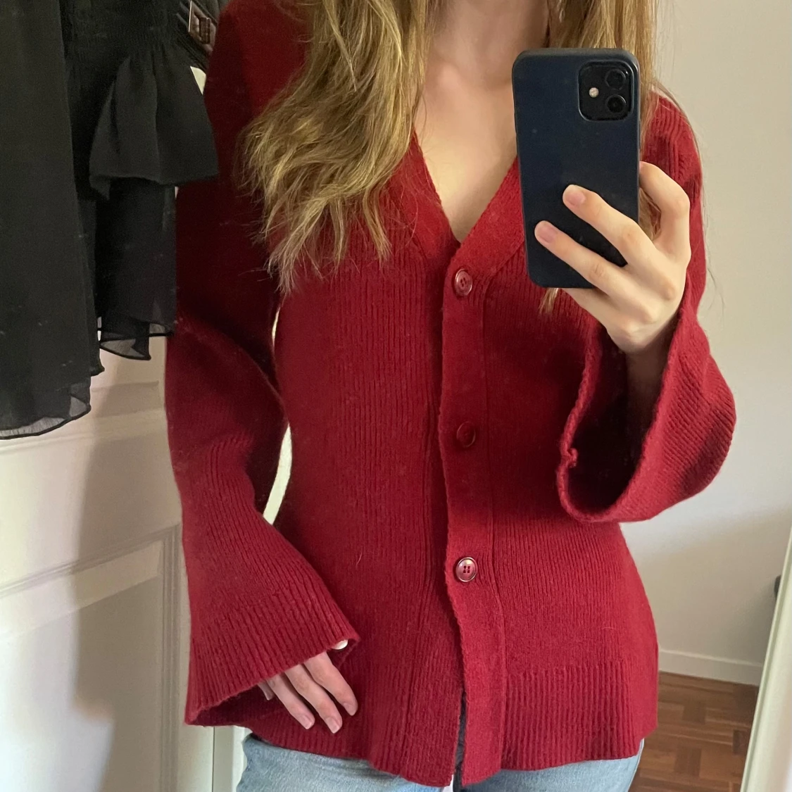 Mysig röd stickad kofta med v-ringning och stora knappar framtill. Koftan har långa, vida ärmar och är figursydd