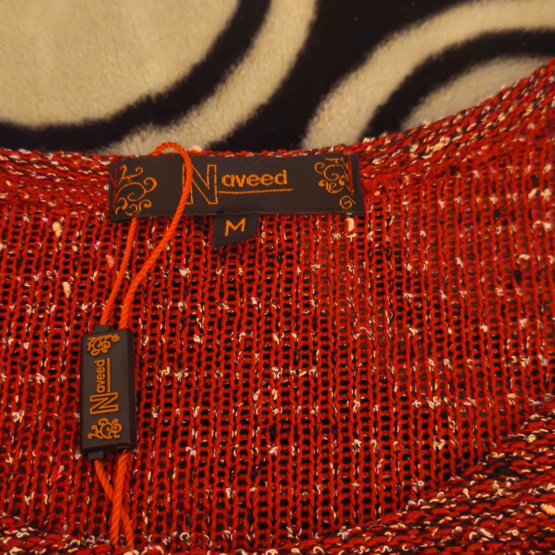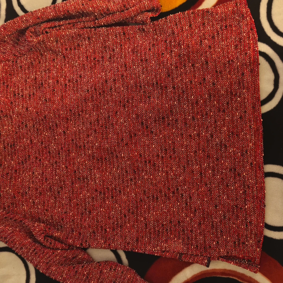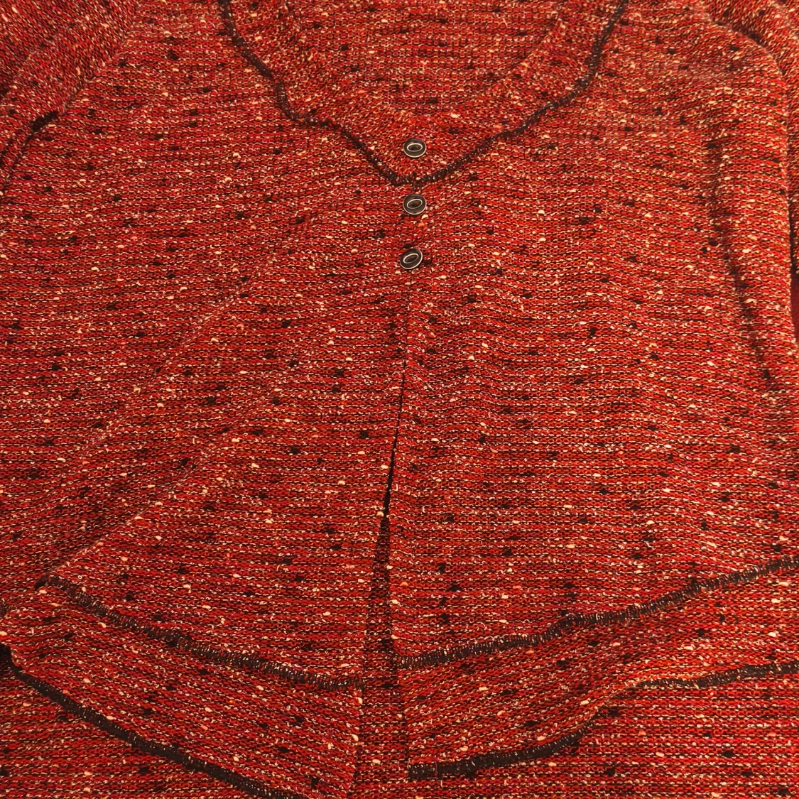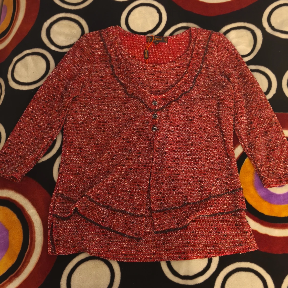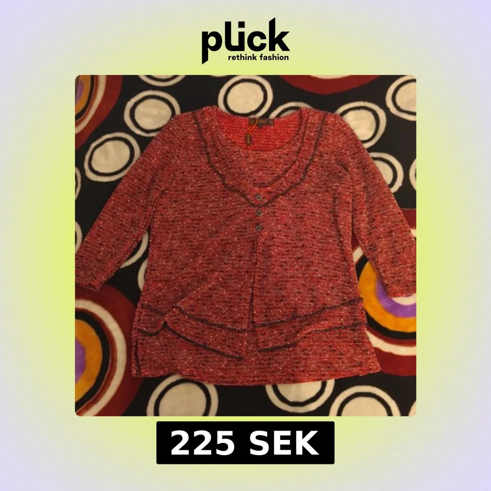 Säljer en röd stickad kofta från Naveed i storlek M. Koftan har tre dekorativa knappar framtill, ett snyggt lager-på-lager utseende och subtila svarta och vita inslag i garnet. Den har trekvartsärm och en mjuk, rundad halsringning med diskret kant.