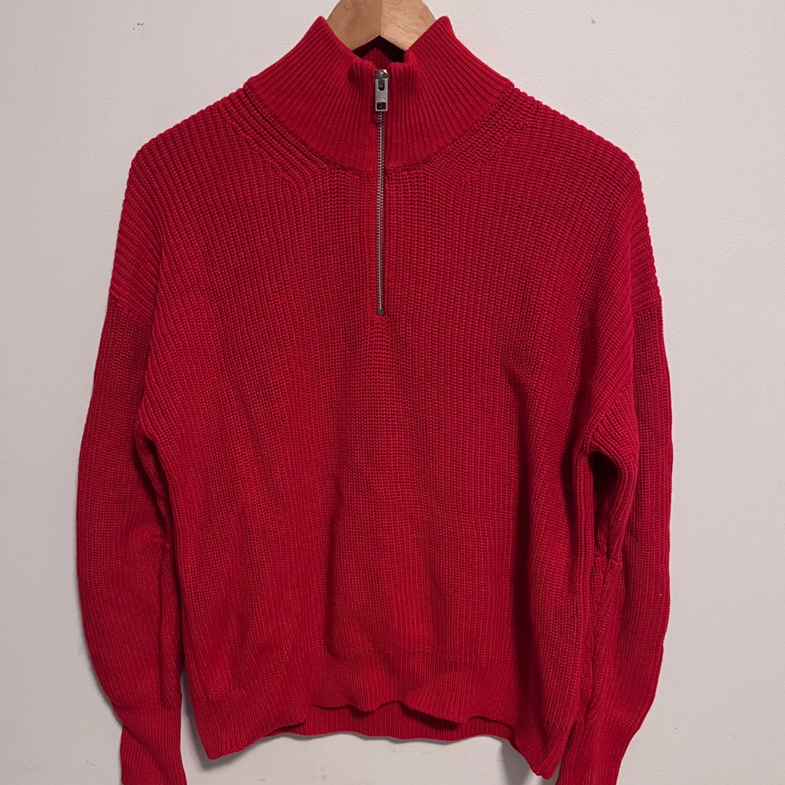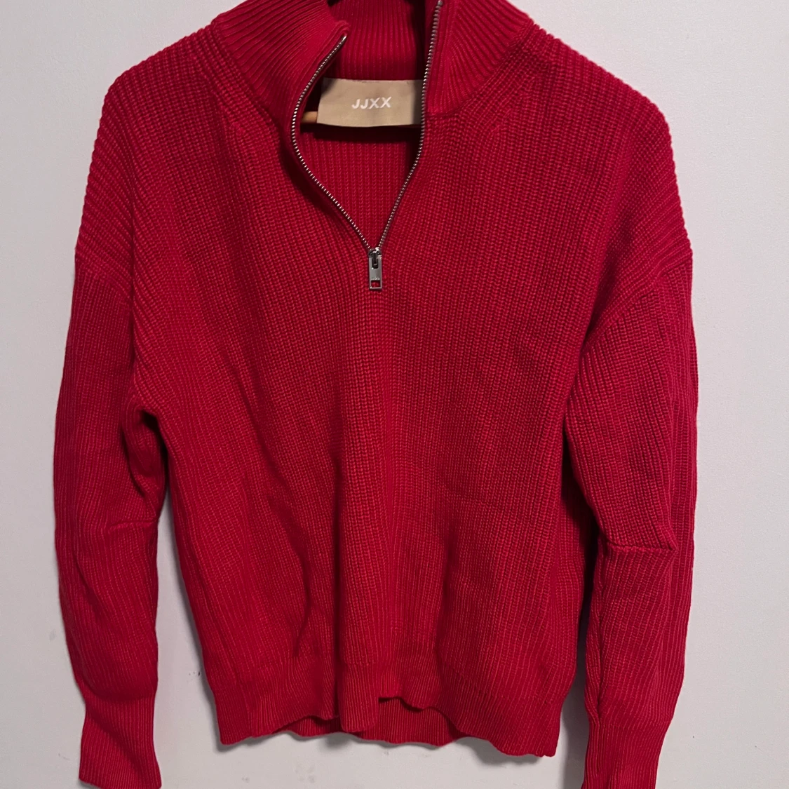 Snygg röd stickad tröja från JJXX med dragkedja i halsen. Perfekt för kyligare dagar med sin varma och bekväma design. Tröjan har långa ärmar och en ribbad struktur som ger en stilren look.